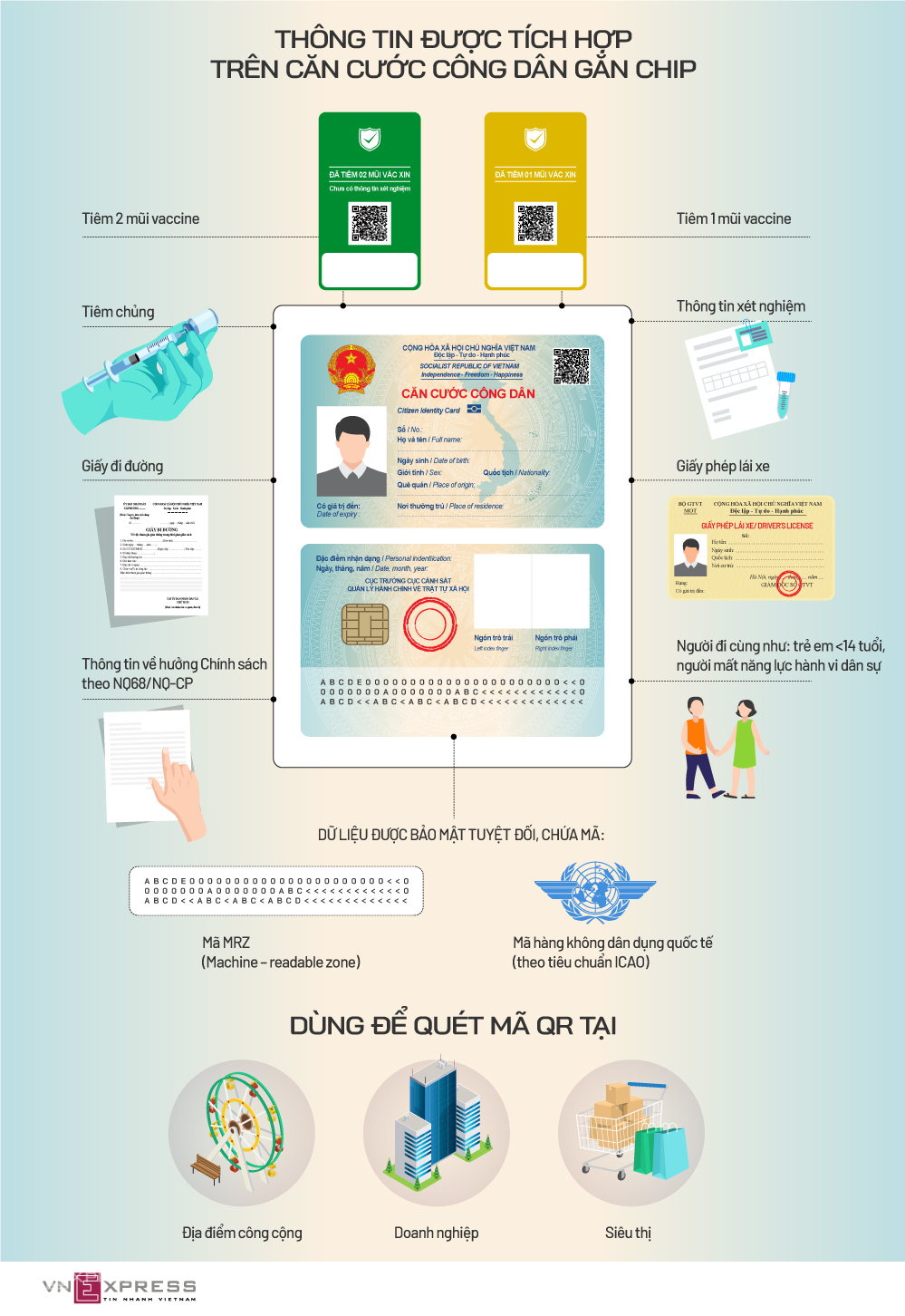 Thẻ căn cước công dân gắn chip sẽ được tích hợp thông tin về thẻ xanh Covid, tiêm chủng, xét nghiệm, giấy đi đường, chế độ chính sách...