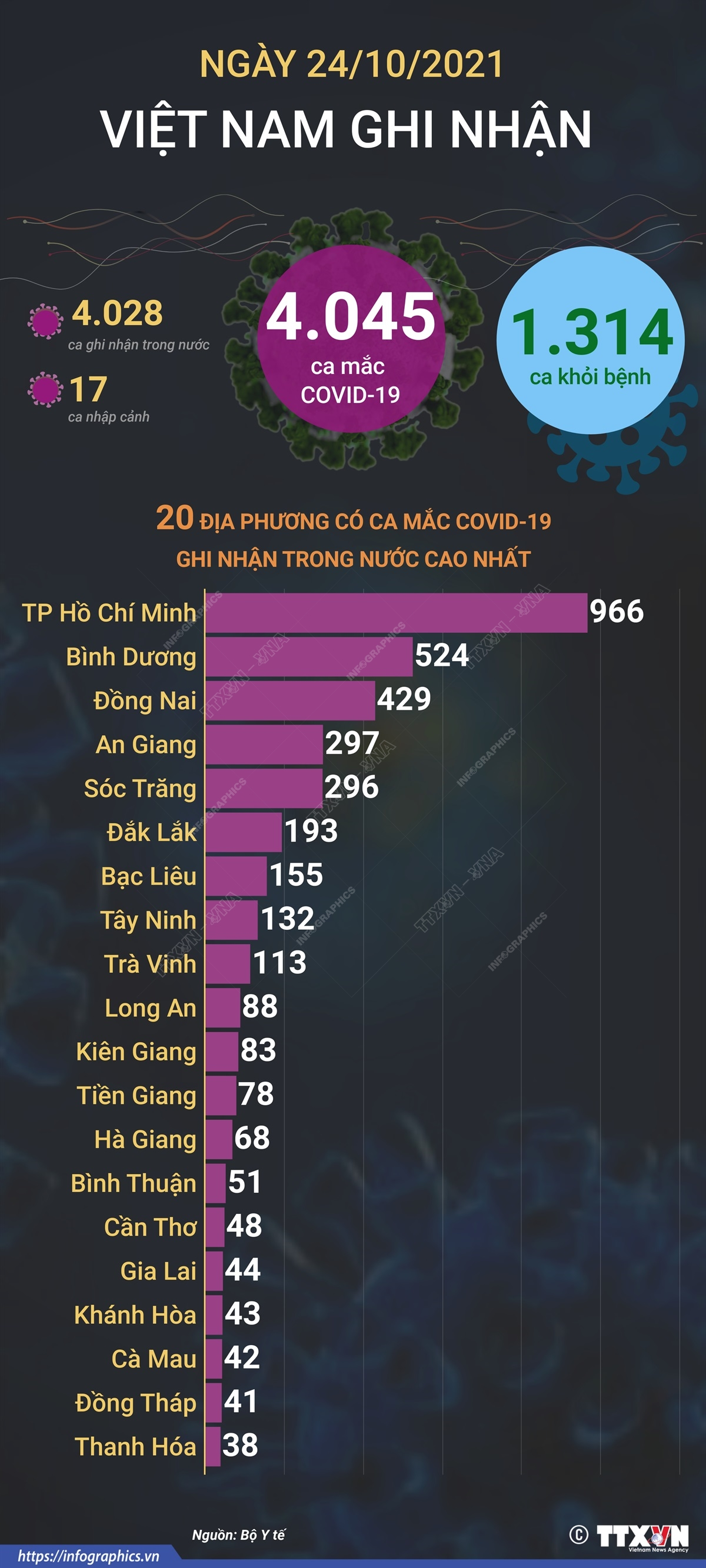 Tính từ 17h ngày 23/10 đến 17h ngày 24/10/2021, Việt Nam ghi nhận 4.045 ca mắc mới COVID-19, trong đó 17 ca nhập cảnh và 4.028 ca trong nước tại 47 tỉnh, thành phố.