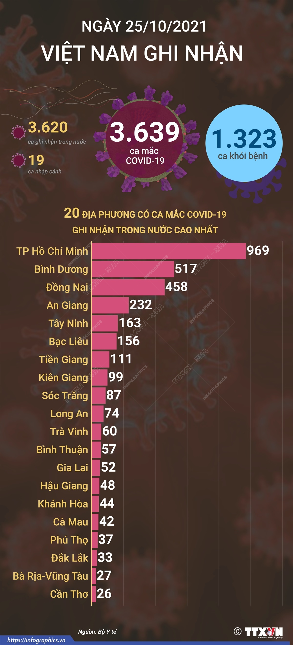 Tính từ 17h ngày 24/10 đến 17h ngày 25/10/2021, Việt Nam ghi nhận 3.639 ca mắc mới COVID-19, trong đó 19 ca nhập cảnh và 3.620 ca trong nước tại 53 tỉnh, thành phố.
