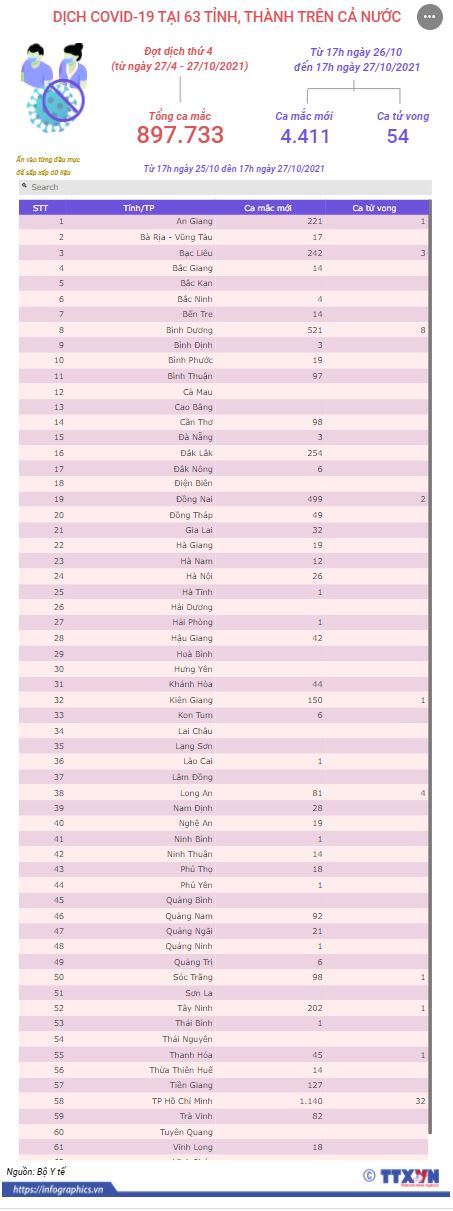 Tính từ 17h ngày 26/10 đến 17h ngày 27/10, trên Hệ thống Quốc gia quản lý ca bệnh COVID-19 ghi nhận 4.411 ca mắc mới và 54 ca tử vong. Dưới đây là chi tiết ca mắc mới và ca tử vong trong 24h qua tại các tỉnh, thành trên cả nước.