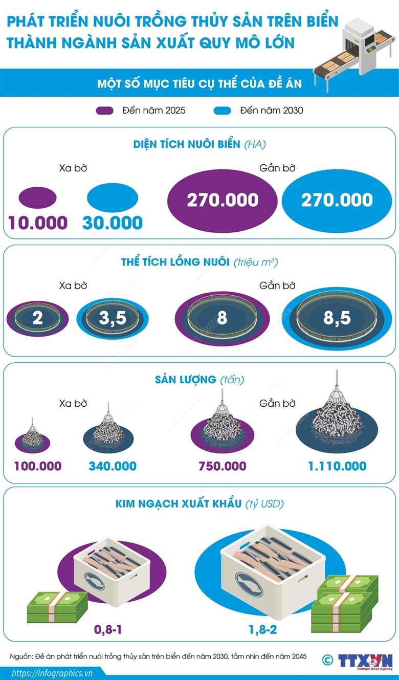Đề án phát triển nuôi trồng thủy sản trên biển đến năm 2030, tầm nhìn đến năm 2045 hướng tới mục tiêu phát triển nuôi trồng thủy sản trên biển (nuôi biển) trở thành một ngành sản xuất hàng hóa quy mô lớn, công nghiệp, đồng bộ, an toàn, hiệu quả, bền vững và bảo vệ môi trường sinh thái tạo ra sản phẩm có thương hiệu, đáp ứng nhu cầu của thị trường trong nước và xuất khẩu giải quyết việc làm, cải thiện điều kiện kinh tế xã hội, nâng cao thu nhập cho cộng đồng cư dân ven biển…
