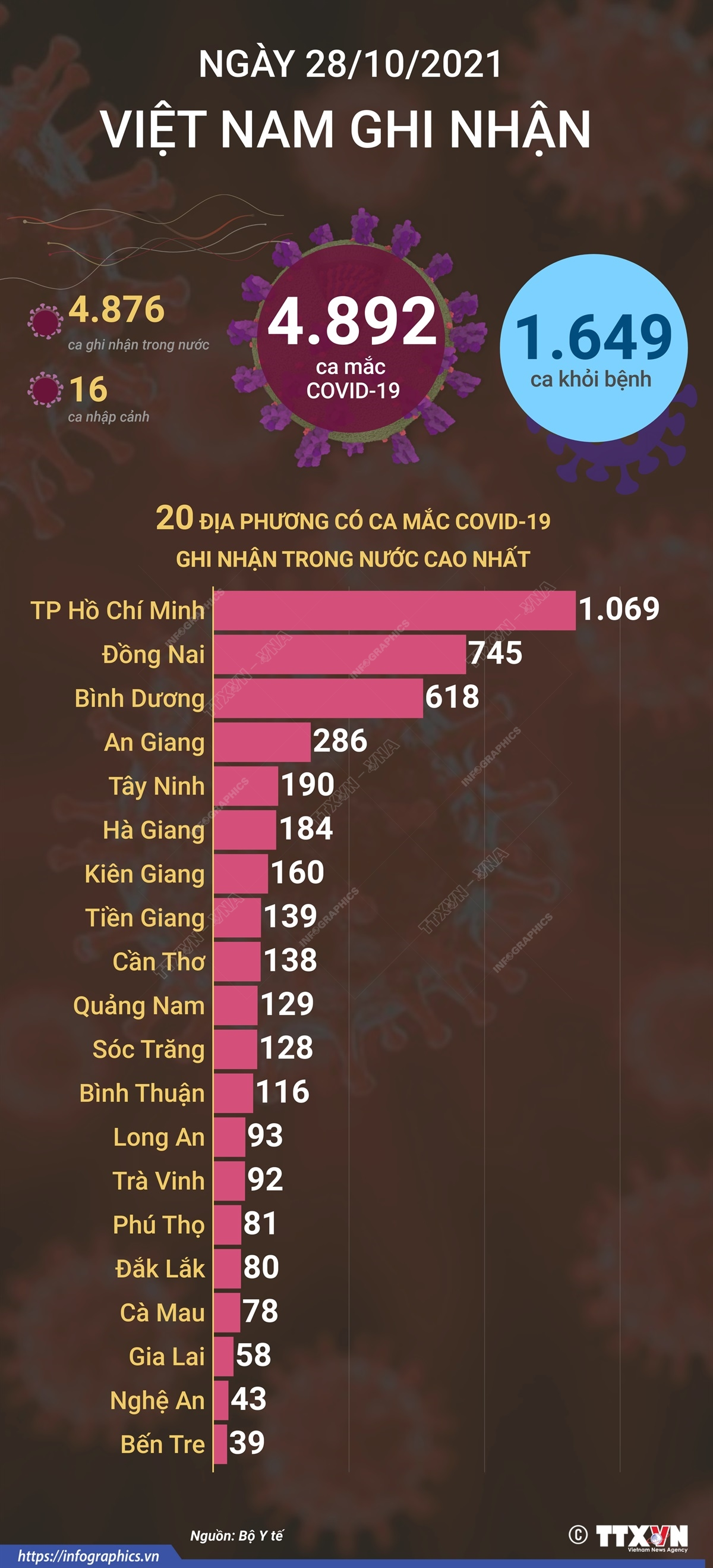 Tính từ 17h ngày 27/10 đến 17h ngày 28/10/2021, Việt Nam ghi nhận 4.892 ca mắc mới COVID-19, trong đó 16 ca nhập cảnh và 4.876 ca trong nước tại 49 tỉnh, thành phố.