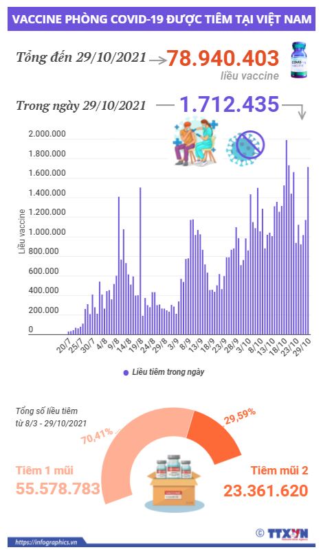 Trong ngày 29/10/2021 có 1.712.435 liều vaccine phòng COVID-19 được tiêm. Như vậy, tổng số liều vaccine đã được tiêm tại Việt Nam là 78.940.403 liều, trong đó tiêm 1 mũi là 55.578.783 liều, tiêm mũi 2 là 23.361.620.
