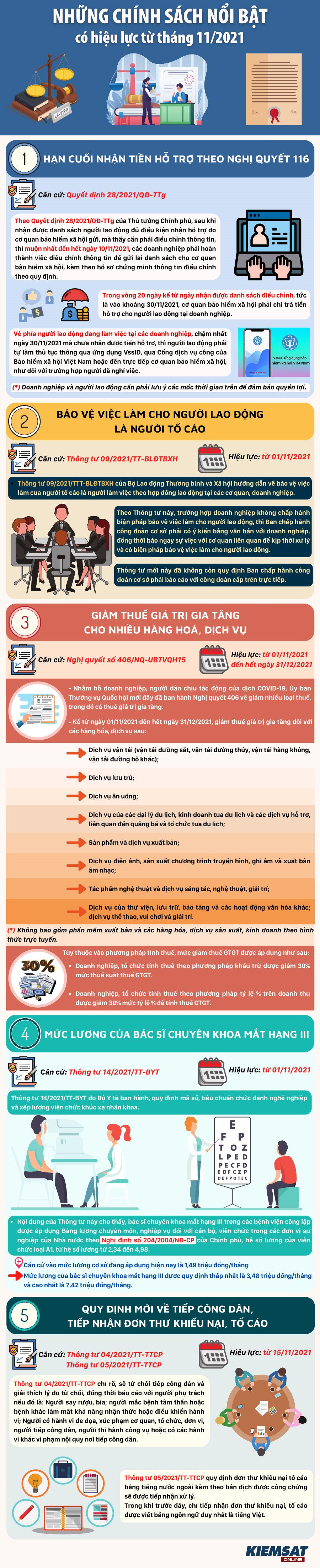 Tháng 11/2021 đánh dấu nhiều chính sách mới chính thức được áp dụng, liên quan trực tiếp đến quyền lợi của người dân như: Giảm thuế giá trị gia tăng cho nhiều hàng hoá, dịch vụ; bảo vệ việc làm cho người cho người lao động là người tố cáo; hạn cuối nhận tiền hỗ trợ theo Nghị quyết 116;...