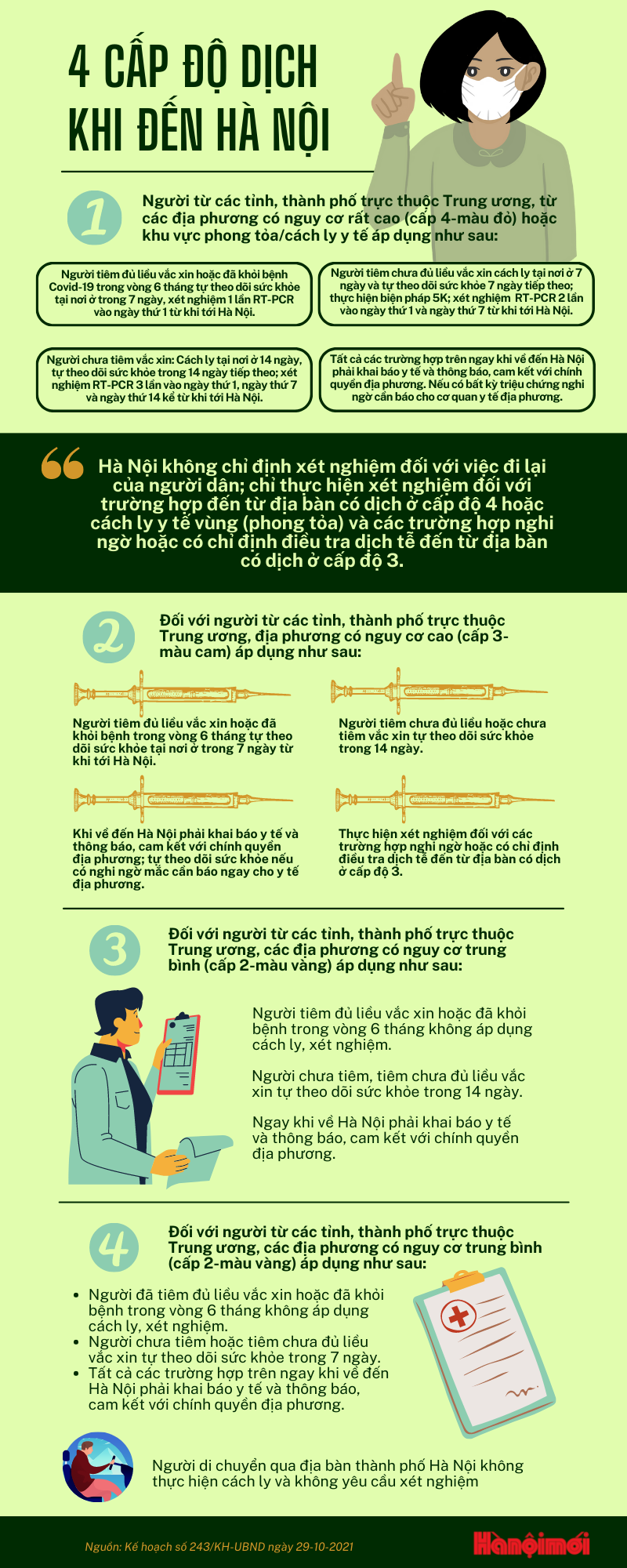 Thành phố Hà Nội đã có hướng dẫn cụ thể đối với người dân đi/đến Hà Nội từ các địa phương cũng như việc di chuyển trong nội thành, sau khi thành phố chuyển từ cấp độ 1 (xanh) sang cấp độ 2 (vàng). Thành phố không chỉ định xét nghiệm đối với việc đi lại của người dân; chỉ thực hiện xét nghiệm đối với trường hợp đến từ địa bàn có dịch ở cấp độ 4 hoặc cách ly y tế vùng (phong tỏa)...