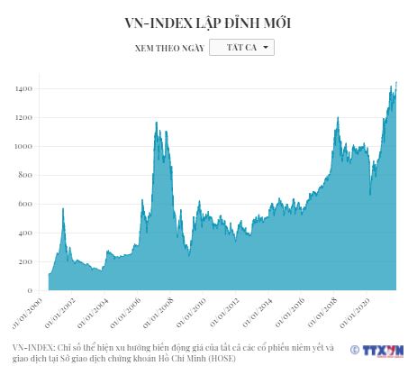 Kết thúc phiên giao dịch ngày 2/11/2021, VN-Index tăng 13,49 điểm lên 1.452,46 điểm, đây là mốc cao nhất của chỉ số này đạt được kể từ khi thị trường chứng khoán đi vào giao dịch.