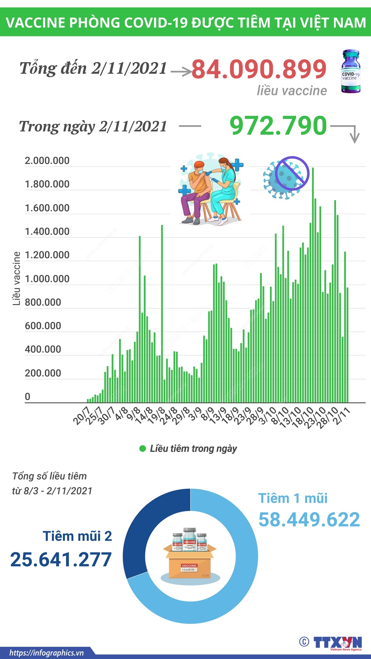Trong ngày 2/11/2021 có 972.790 liều vaccine phòng COVID-19 được tiêm. Như vậy, tổng số liều vaccine đã được tiêm tại Việt Nam là 84.090.899 liều, trong đó tiêm 1 mũi là 58.449.622 liều, tiêm mũi 2 là 25.641.277.