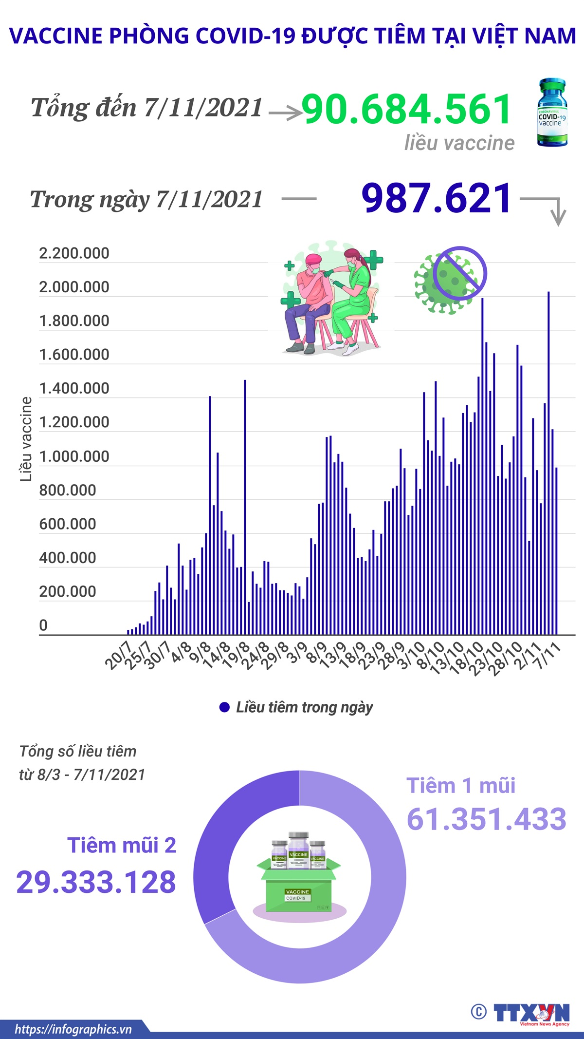 Trong ngày 7/11/2021 có 987.621 liều vaccine phòng COVID-19 được tiêm. Như vậy, tổng số liều vaccine đã được tiêm tại Việt Nam là 90.684.561 liều, trong đó tiêm 1 mũi là 61.351.433 liều, tiêm mũi 2 là 29.333.128.