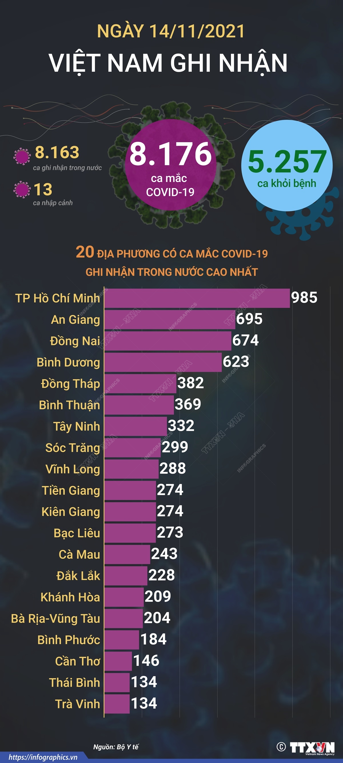 Tính từ 16h ngày 13/11 đến 16h ngày 14/11/2021, Việt Nam ghi nhận 8.176 ca mắc mới COVID-19, trong đó 13 ca nhập cảnh và 8.163 ca trong nước tại 52 tỉnh, thành phố.