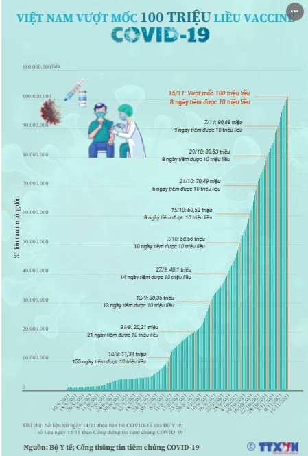 Theo số liệu trên Cổng thông tin tiêm chủng COVID-19, tính tới ngày 15/11/2021, Việt Nam đã vượt 100 triệu liều vaccine COVID-19. Như vậy, Việt Nam đã hoàn thành được 2/3 mục tiêu 150 triệu liều trong nửa cuối của năm 2021 và đầu năm 2022 của chiến dịch tiêm chủng quy mô lớn nhất trong lịch sử tiêm chủng của đất nước.
