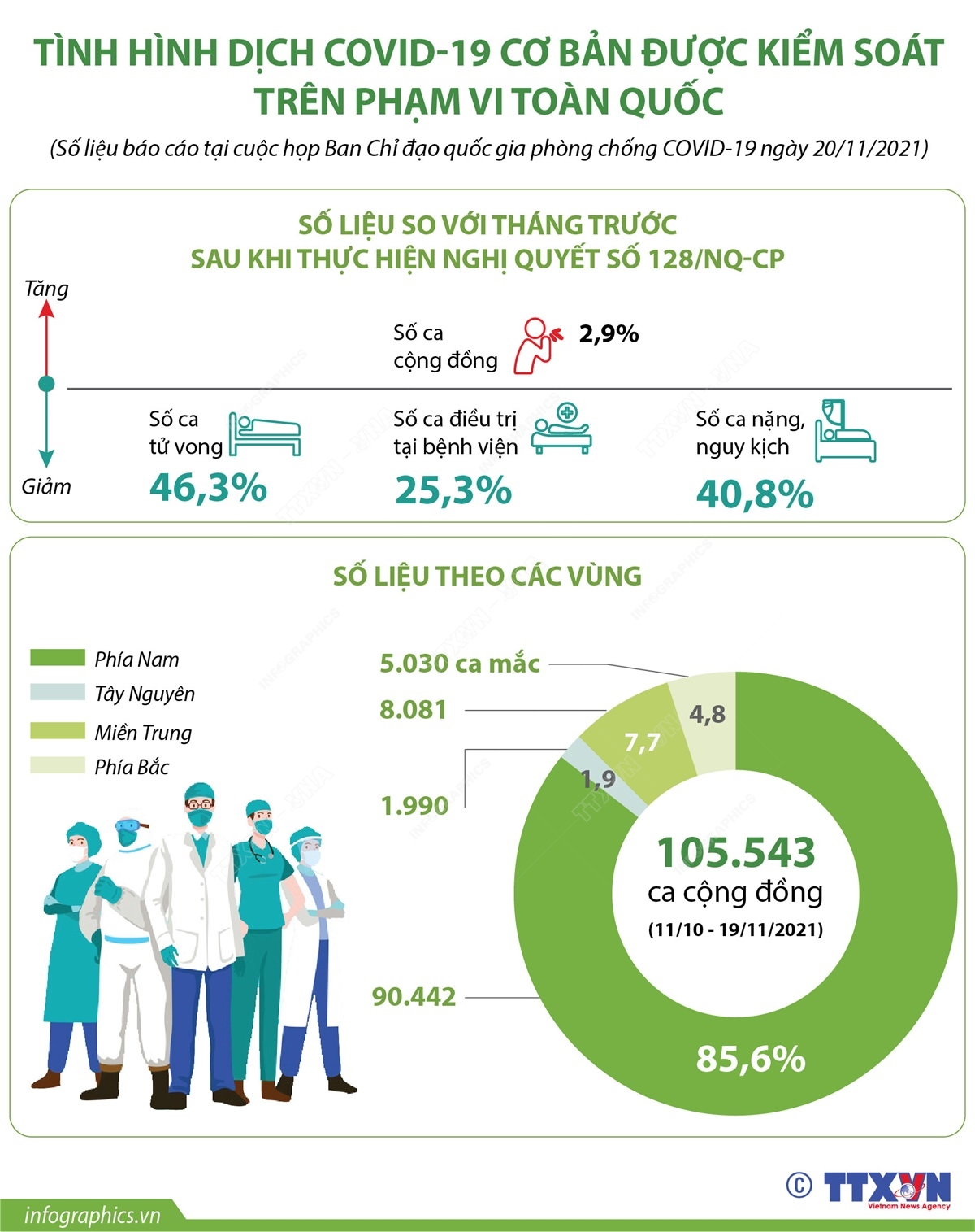 Tình hình dịch COVID-19 hiện cơ bản được kiểm soát trên phạm vi toàn quốc. So với tháng trước đó, số ca tử vong giảm 46,3%, số đang điều trị tại bệnh viện giảm 25,3%, số ca nặng, nguy kịch giảm 40,8%. Tuy nhiên, số ca cộng đồng tăng 2,9% và đang có xu hướng gia tăng ở nhiều địa phương trên cả nước.
