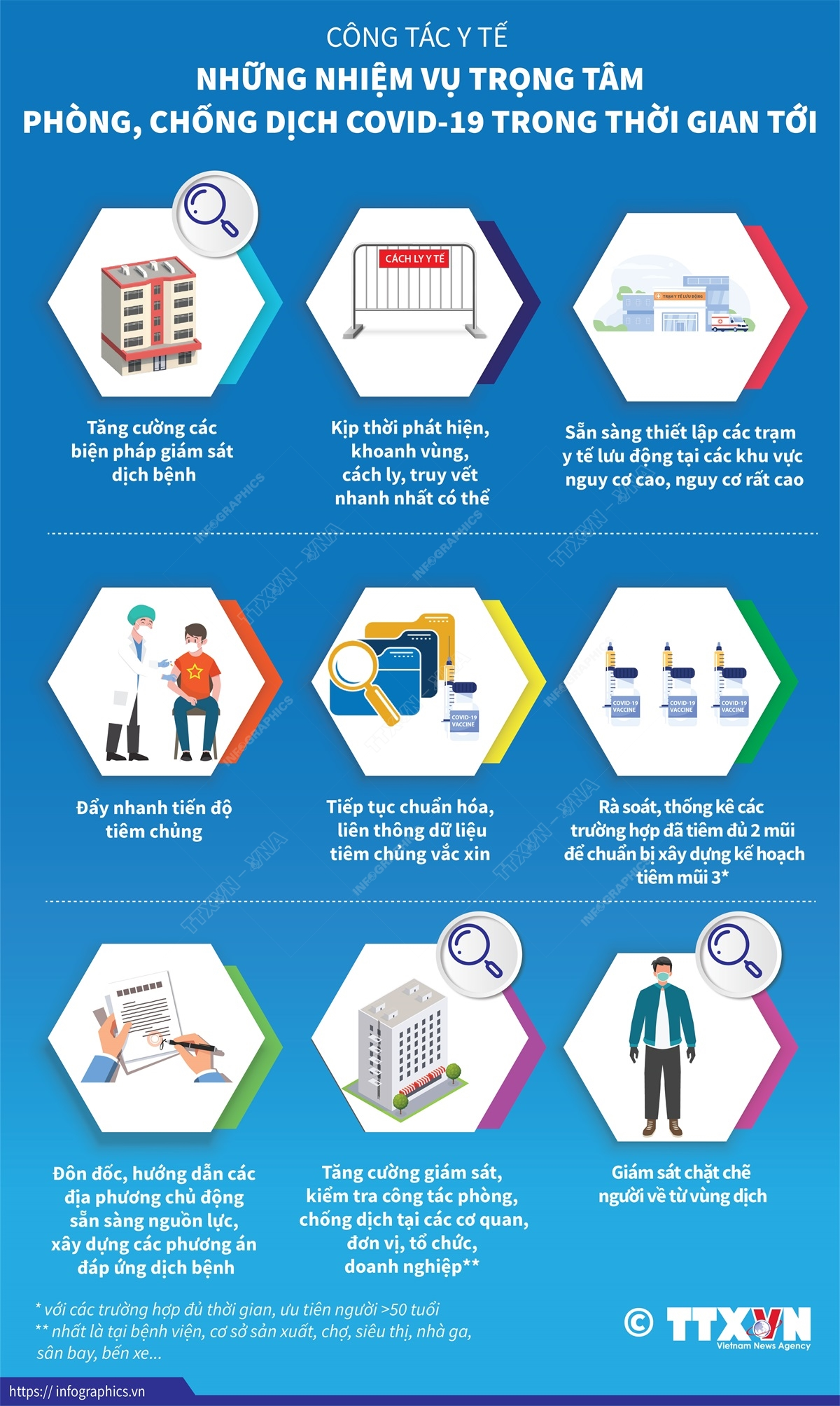 Trong thời gian tới, ngành y tăng cường các biện pháp giám sát dịch bệnh kịp thời phát hiện, khoanh vùng, cách ly, truy vết nhanh nhất có thể sẵn sàng thiết lập các trạm y tế lưu động tại các khu vực nguy cơ cao, nguy cơ rất cao đẩy nhanh tiến độ tiêm chủng tiếp tục chuẩn hóa, liên thông dữ liệu tiêm chủng vắc xin phòng COVID-19…