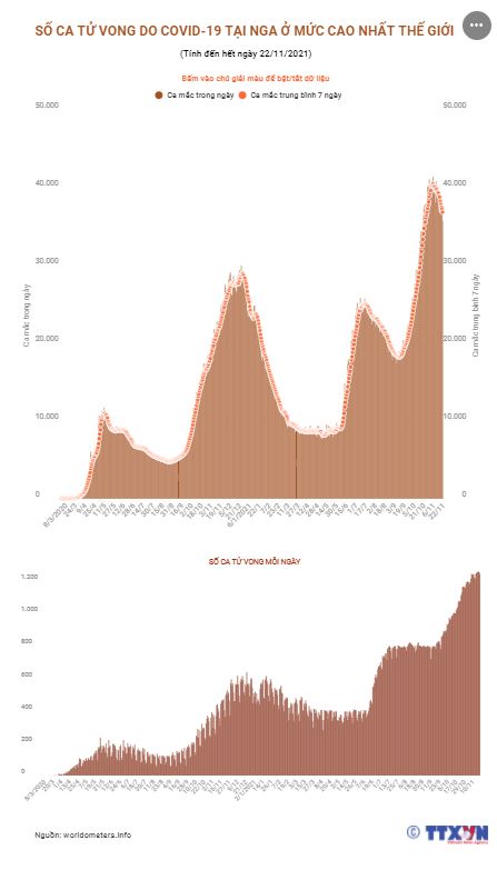 Trong những ngày gần đây, số ca tử vong do COVID-19 tại Nga luôn ở mức cao nhất thế giới, trên 1.200 ca/ngày. Theo trang worldometers.info, ngày 22/11/2021, Nga ghi nhận thêm 1.241 ca tử vong do COVID-19, nâng tổng số ca tử vong lên 265.336. Trong ngày, Nga cũng ghi nhận thêm 35.681 ca mắc COVID-19.