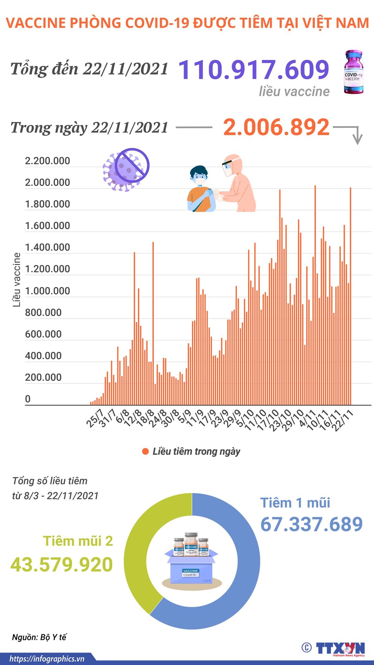 Trong ngày 22/11/2021 có 2.006.892 liều vaccine phòng COVID-19 được tiêm. Như vậy, tổng số liều vaccine đã được tiêm tại Việt Nam là 110.917.609 liều, trong đó tiêm 1 mũi là 67.337.689 liều, tiêm mũi 2 là 43.579.920.