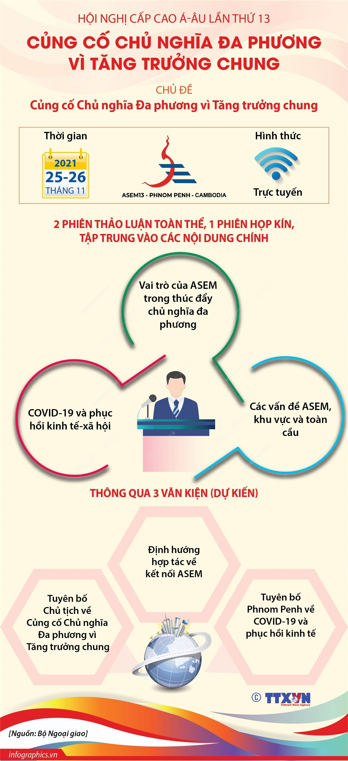 Nhận lời mời của Thủ tướng Vương quốc Campuchia Samdech Akka Moha Sena Padei Techo Hun Sen - Thủ tướng nước chủ nhà Hội nghị Cấp cao Á-Âu (ASEM) lần thứ 13, Thủ tướng Chính phủ Phạm Minh Chính sẽ tham dự Hội nghị ASEM lần thứ 13 theo hình thức trực tuyến trong 2 ngày 25 và 26/11/2021.