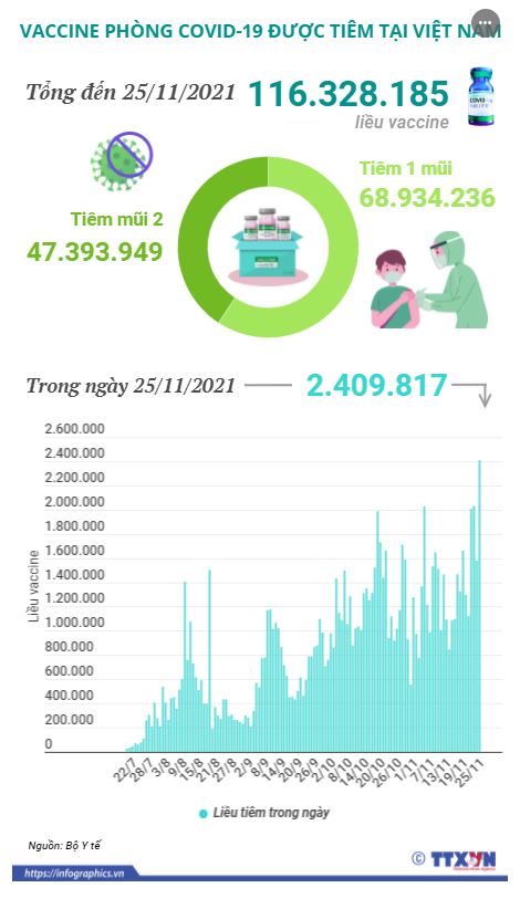 Trong ngày 25/11/2021 có 2.409.817 liều vaccine phòng COVID-19 được tiêm. Như vậy, tổng số liều vaccine đã được tiêm tại Việt Nam là 116.328.185 liều, trong đó tiêm 1 mũi là 68.934.236 liều, tiêm mũi 2 là 47.393.949.