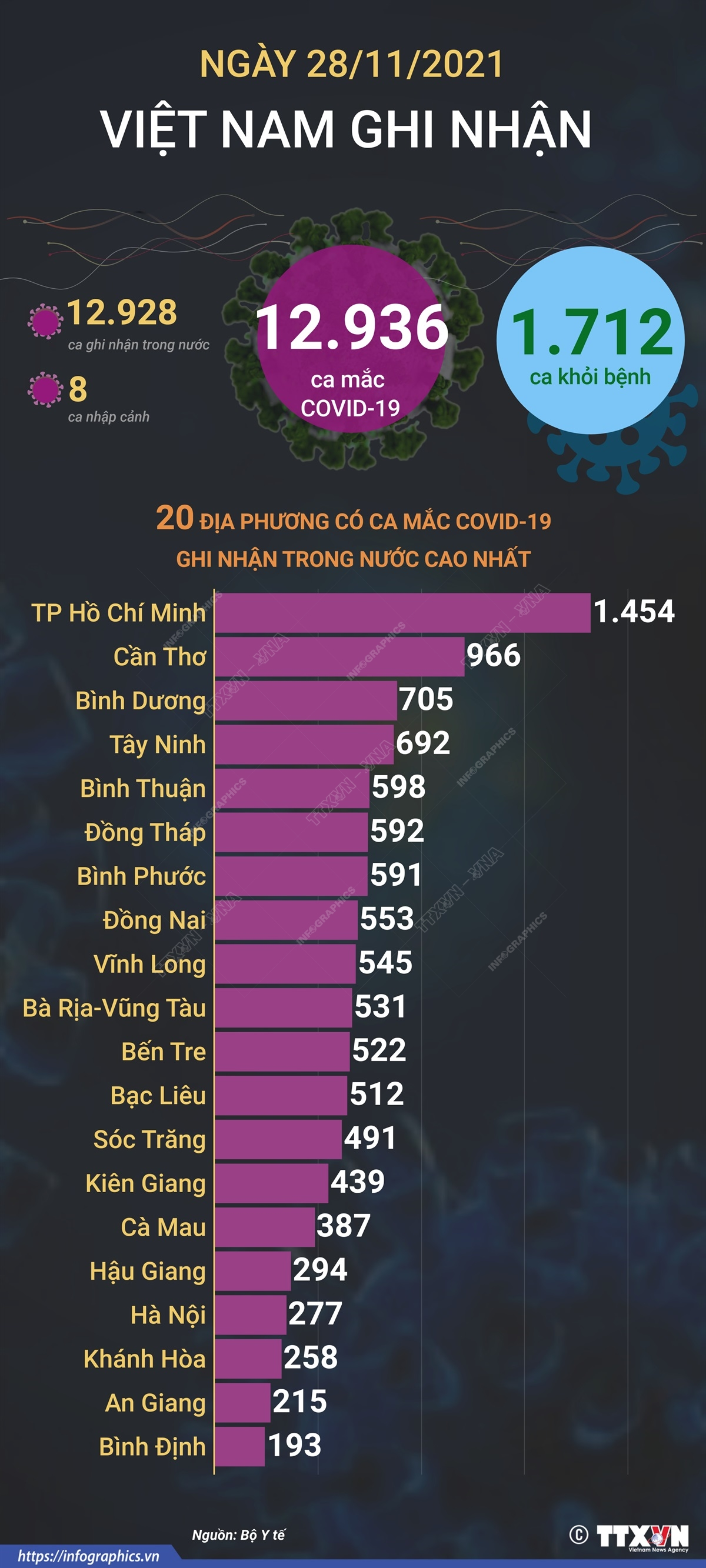 12.936 ca mắc Covid-19 trong ngày 28/11/2021, 1.712 ca khỏi bệnh