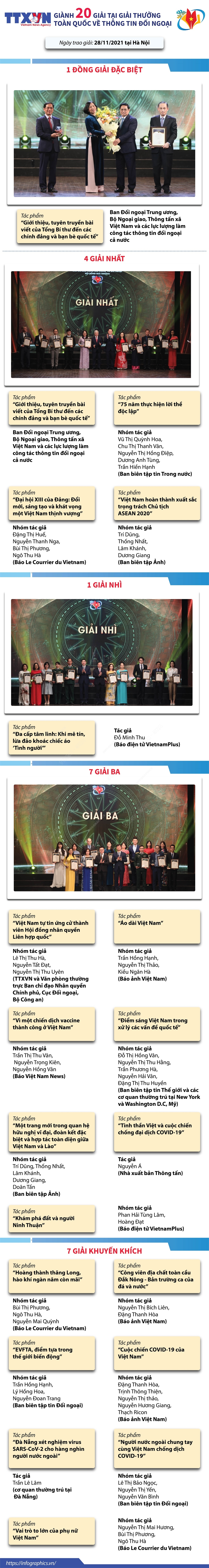 Năm nay, tại Giải thưởng toàn quốc về thông tin đối ngoại lần thứ VII, Thông tấn xã Việt Nam tiếp tục gặt hái thành công lớn với 20 giải thưởng gồm 1 đồng giải Đặc biệt, 4 giải Nhất, 1 giải Nhì, 7 giải Ba và 7 giải Khuyến khích. Lễ trao giải diễn ra tại Hà Nội tối 28/11/2021.