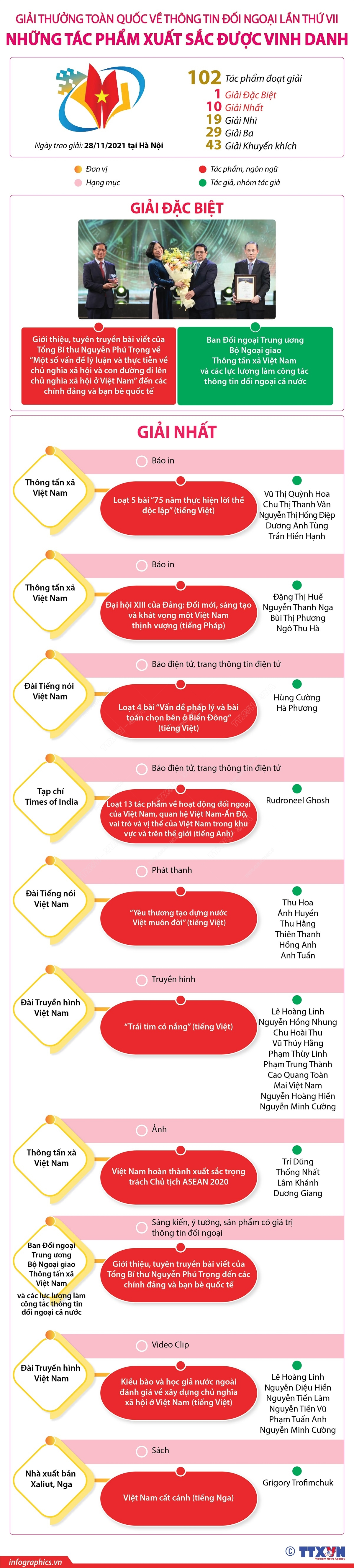 Tại Lễ trao giải thưởng toàn quốc về Thông tin đối ngoại lần thứ VII, Ban Tổ chức đã trao giải cho 102 tác phẩm, sản phẩm xuất sắc gồm: 1 giải Đặc biệt, 10 giải Nhất, 19 giải Nhì, 29 giải Ba và 43 giải Khuyến khích. Lễ trao giải diễn ra tối 28/11/2021 tại Hà Nội.