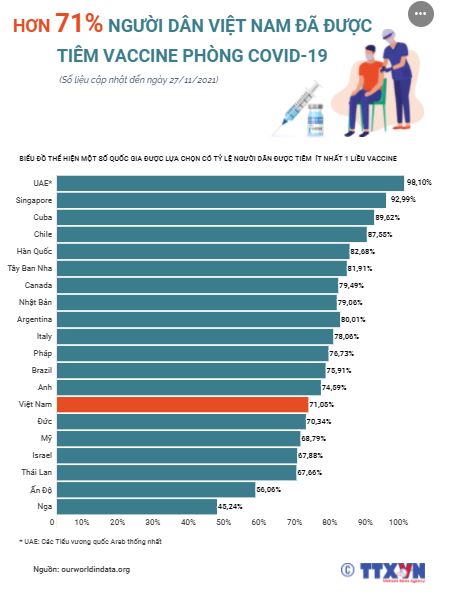 Trong những tháng gần đây, Việt Nam liên tục đẩy nhanh tốc độ tiêm vaccine phòng COVID-19. Đến hết ngày 27/11/2021, tổng số liều vaccine đã tiêm đạt gần 118,8 triệu liều, trong đó tiêm 1 mũi là 69.747.303 liều, tiêm mũi 2 là 49.021.083 liều. 71,05% dân số được tiêm ít nhất 1 mũi vaccine phòng COVID-19.