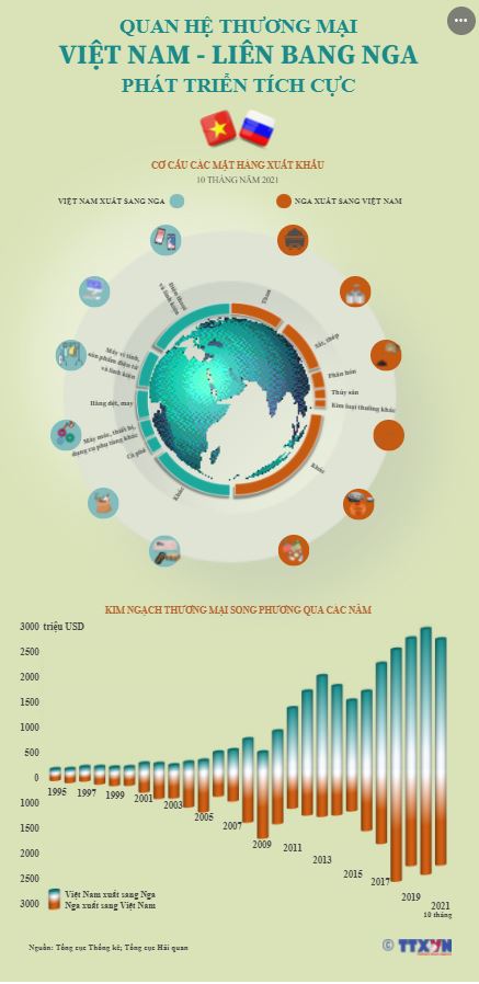 Hợp tác thương mại Việt Nam - Liên bang Nga đạt được những bước phát triển tích cực trong thời gian qua. Kim ngạch thương mại song phương tăng trưởng trung bình 12,6% trong giai đoạn 2015-2020. Tính riêng trong năm 2020, trao đổi thương mại giữa hai nước đạt 4,85 tỷ USD, tăng gần 8% so với năm 2019.