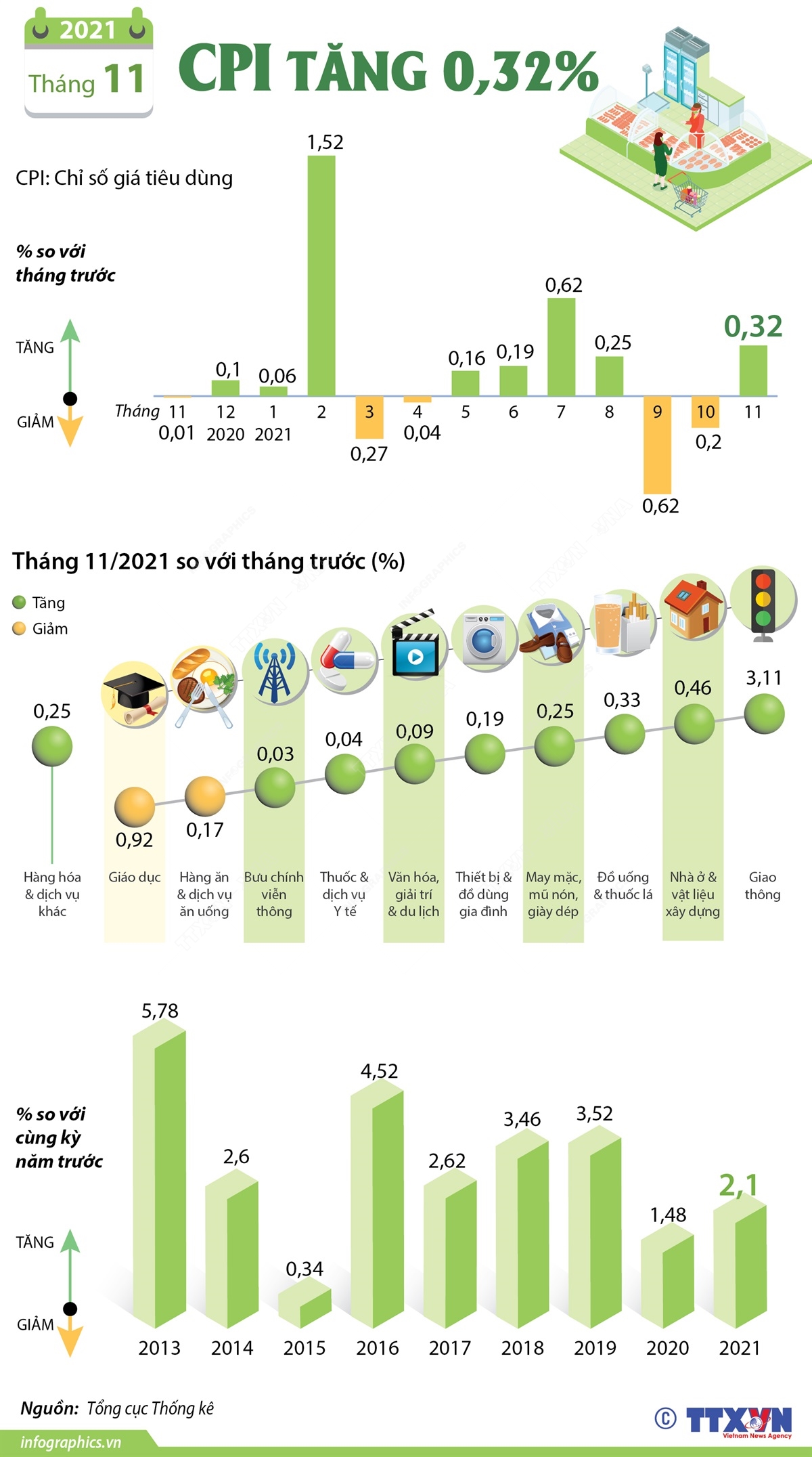 Chỉ số giá tiêu dùng (CPI) tháng 11/2021 tăng 0,32% so với tháng trước đó. Trong đó, có 9 nhóm hàng hóa và dịch vụ có chỉ số giá tăng và 2 nhóm hàng có chỉ số giá giảm.