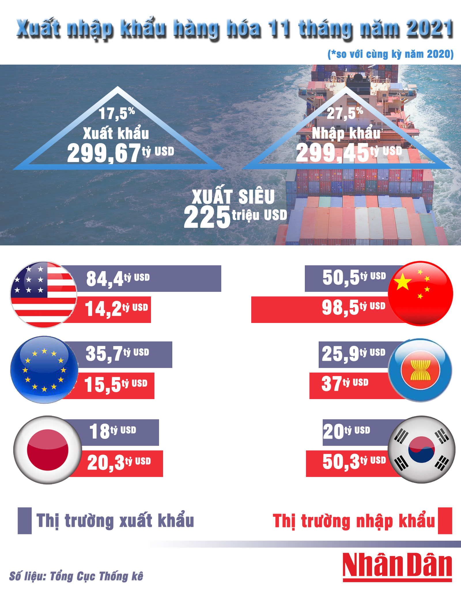 Thương mại hàng hóa của Việt Nam duy trì đà phục hồi thần tốc khi kim ngạch xuất khẩu trong 11 tháng đầu năm 2021 cán mốc 299,67 tỷ USD (tăng 17,5% so với cùng kỳ năm trước) và nhập khẩu đạt 299,45 tỷ USD (tăng 27,5%), bất chấp những tác động nặng nề của dịch Covid-19 trong 3 quý đầu năm.