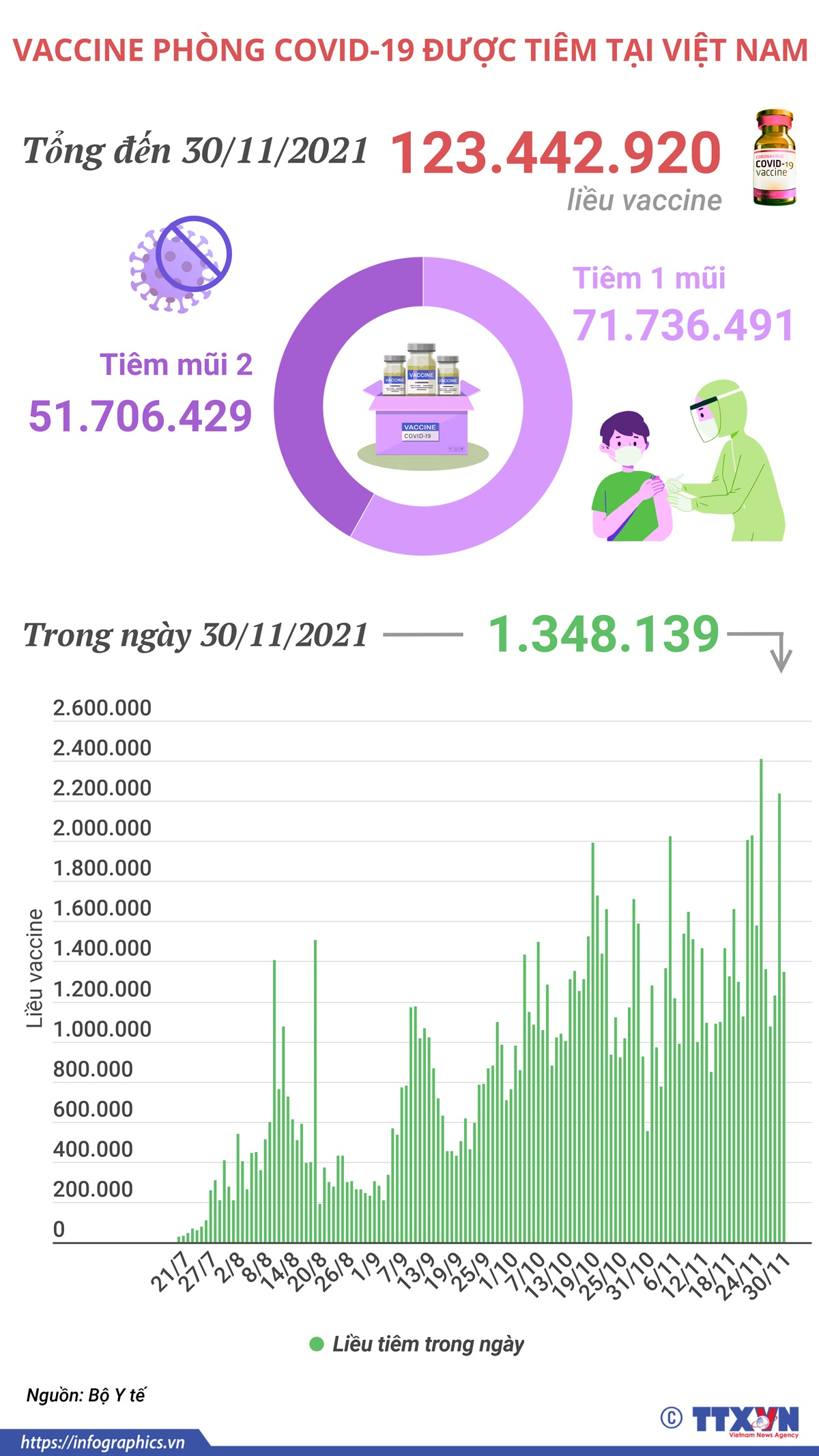 Trong ngày 30/11/2021 có 1.348.139 liều vaccine phòng COVID-19 được tiêm. Như vậy, tổng số liều vaccine đã được tiêm tại Việt Nam là 123.442.920 liều, trong đó tiêm 1 mũi là 71.736.491 liều, tiêm mũi 2 là 51.706.429.
