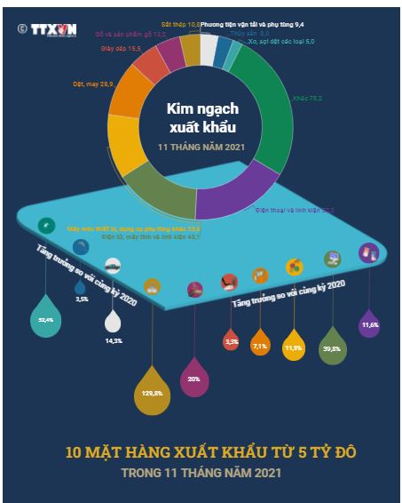 Trong 11 tháng năm 2021, có 10 mặt hàng đạt giá trị xuất khẩu từ 5 tỷ USD trở lên, chiếm gần 74% tổng kim ngạch xuất khẩu của toàn nền kinh tế. Các mặt hàng đó là: Điện thoại và linh kiện (52 tỷ USD); điện tử, máy tính và linh kiện (45,1 tỷ USD); máy móc thiết bị, dụng cụ phụ tùng khác (33,6 tỷ USD)...