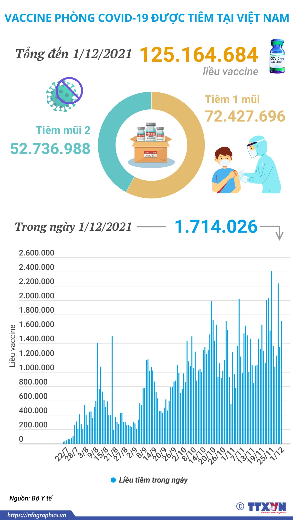 Trong ngày 1/12/2021 có 1.714.026 liều vaccine phòng COVID-19 được tiêm. Như vậy, tổng số liều vaccine đã được tiêm tại Việt Nam là 125.164.684 liều, trong đó tiêm 1 mũi là 72.427.696 liều, tiêm mũi 2 là 52.736.988.