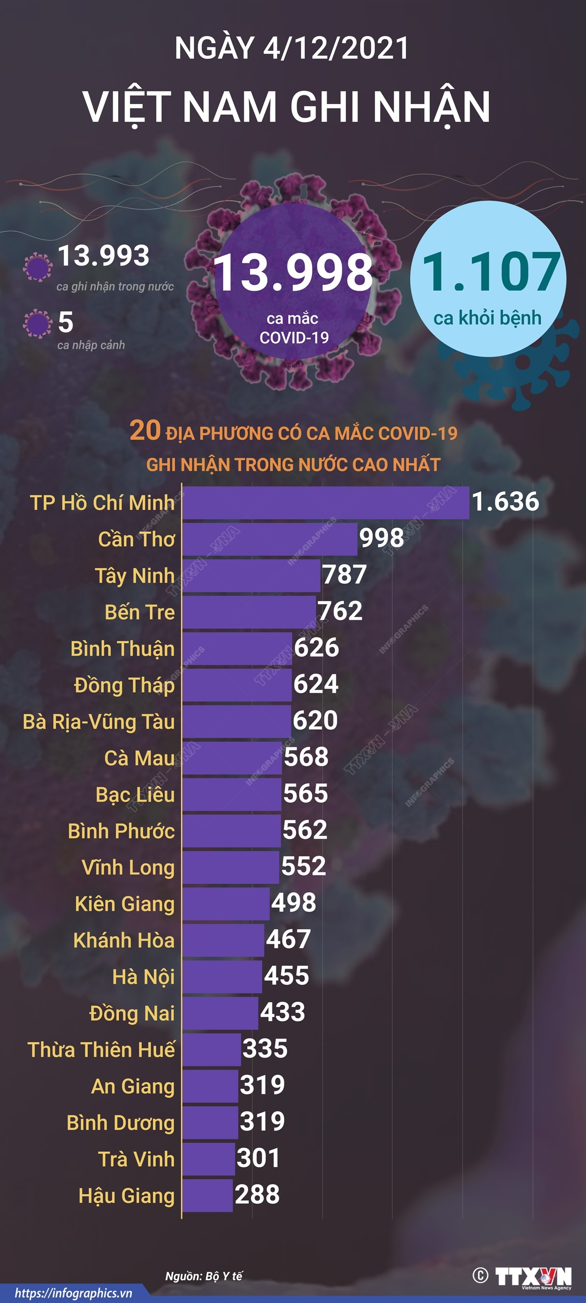 Tính từ 16h ngày 3/12 đến 16h ngày 4/12/2021, Việt Nam ghi nhận 13.998 ca mắc mới COVID-19, trong đó 5 ca nhập cảnh và 13.993 ca trong nước tại 57 tỉnh, thành phố.