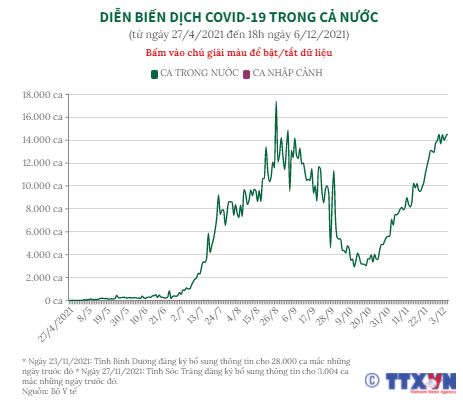 Biểu đồ thể hiện số ca mắc COVID-19 trong nước và nhập cảnh của đợt dịch thứ tư qua mỗi ngày, từ ngày 27/4 đến 18h ngày 6/12/2021. Số ca mắc COVID-19 trong cả nước đang tăng lên.