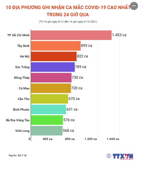 Ngày 9/12/2021, cả nước có 15.311 ca mắc COVID-19 tại 61 tỉnh, thành phố. Trong đó, các địa phương ghi nhận số ca mắc tăng cao nhất so với ngày trước đó: Hà Nội tăng 426 ca, Cà Mau tăng 209 ca… Đặc biệt Hà Nội ghi nhận 822 ca, đây là số ca mắc mới trong 24 giờ cao nhất từ trước tới nay.
