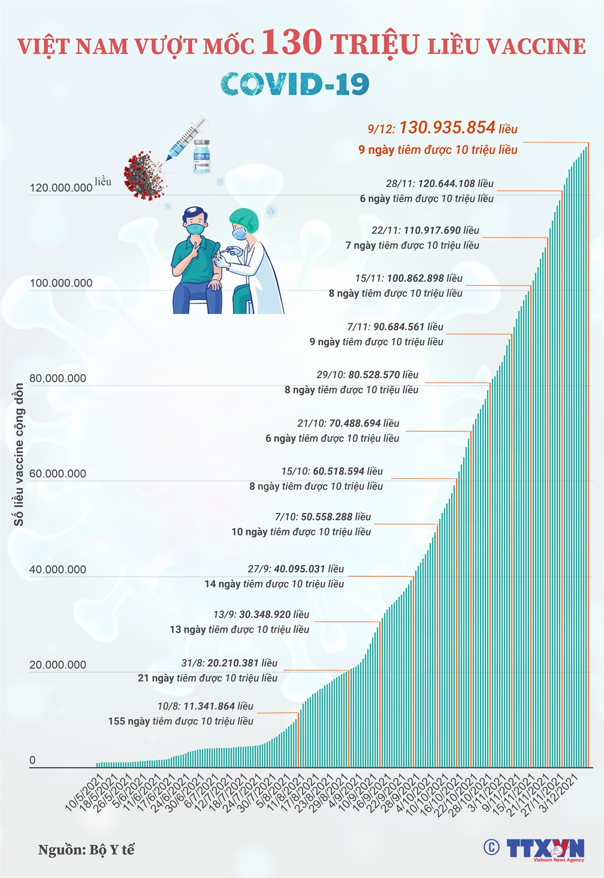 Tính tới ngày 9/12/2021, Việt Nam đã vượt hơn 130,9 triệu liều tiêm vaccine phòng COVID-19. Tổng số tiêm 1 mũi là 74.550.657 liều, tiêm mũi 2 là 56.385.197. Riêng trong ngày 9/12/2021 có 1.029.505 liều vaccine phòng COVID-19 được tiêm.