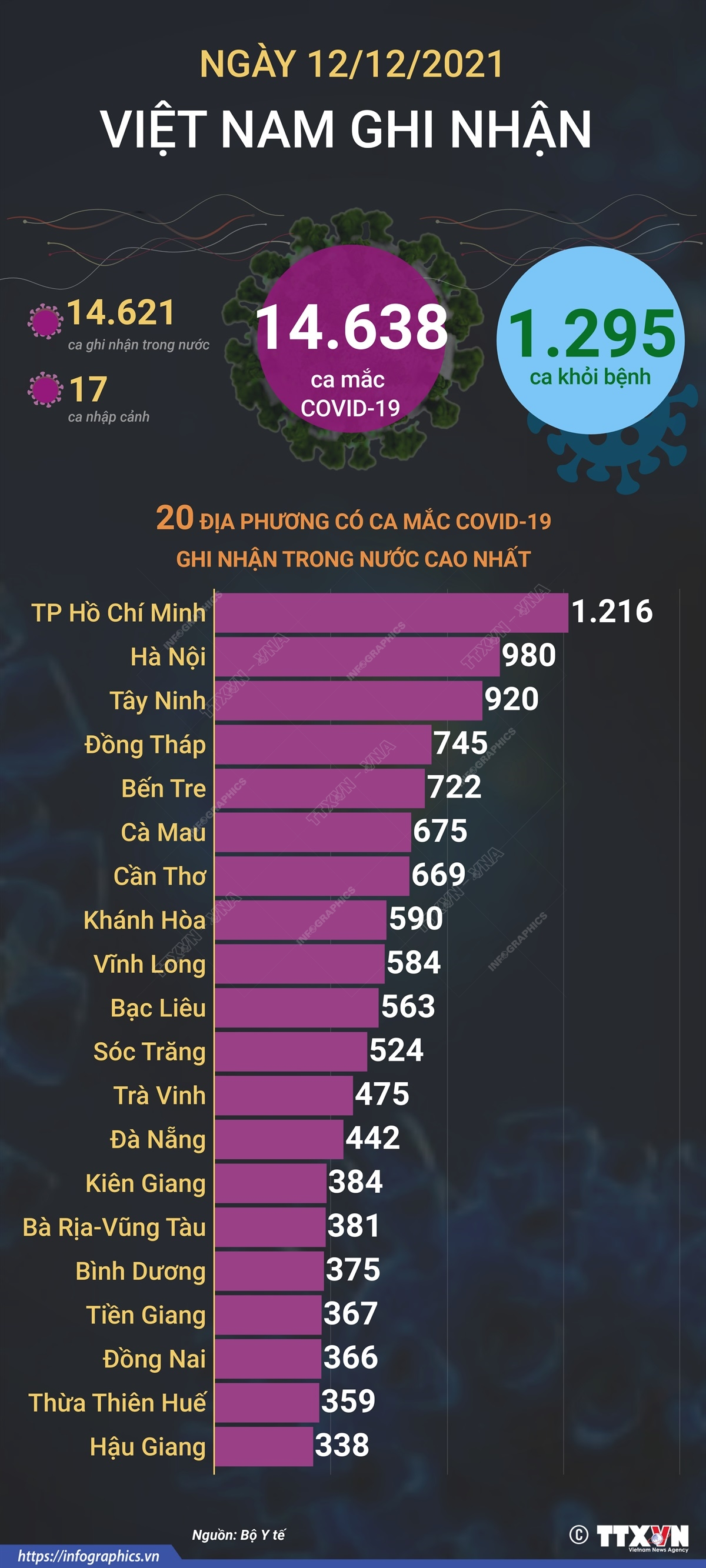 Tính từ 16h ngày 11/12 đến 16h ngày 12/12/2021, Việt Nam ghi nhận 14.638 ca mắc mới COVID-19, trong đó 17 ca nhập cảnh và 14.621 ca trong nước tại 58 tỉnh, thành phố.