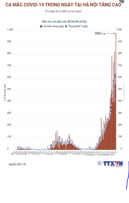 Ngày 12/12/2021, Hà Nội ghi nhận 980 ca mắc COVID-19 mới trong ngày, tăng 432 ca so với ngày trước đó; chỉ đứng sau TP Hồ Chí Minh về số ca mắc mới. Trong những ngày gần đây, Hà Nội luôn nằm trong số những địa phương có ca mắc mới cao của cả nước, trong đó có hàng trăm ca mắc trong cộng đồng.