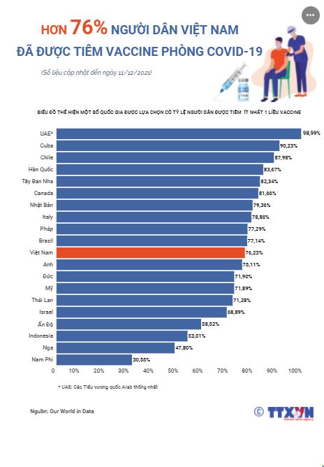Trong những tháng gần đây, Việt Nam liên tục đẩy nhanh tốc độ tiêm vaccine phòng COVID-19. Việt Nam hiện là một trong 20 nước có số liều vaccine tiêm chủng nhiều nhất đã có trên 132 triệu liều vaccine được tiêm, trong đó tiêm mũi 1 là gần 74,9 triệu liều, tiêm mũi 2 là trên 57,4 triệu liều. Cả nước đã có 76,23% dân số được tiêm ít nhất 1 mũi vaccine phòng COVID-19.
