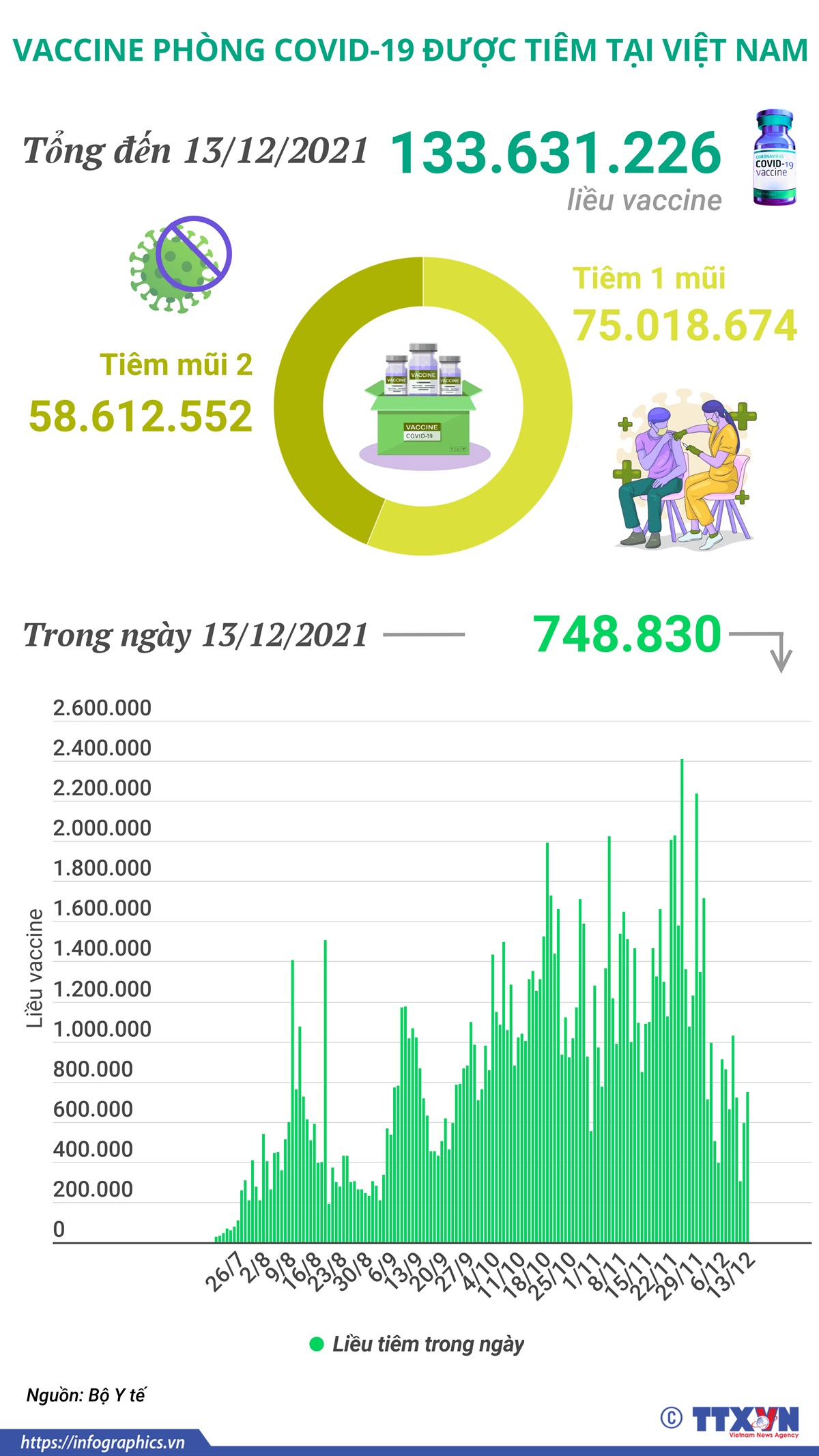 Trong ngày 13/12/2021 có 748.830 liều vaccine phòng COVID-19 được tiêm. Như vậy, tổng số liều vaccine đã được tiêm tại Việt Nam là 133.631.226 liều, trong đó tiêm 1 mũi là 75.018.674 liều, tiêm mũi 2 là 58.612.552.