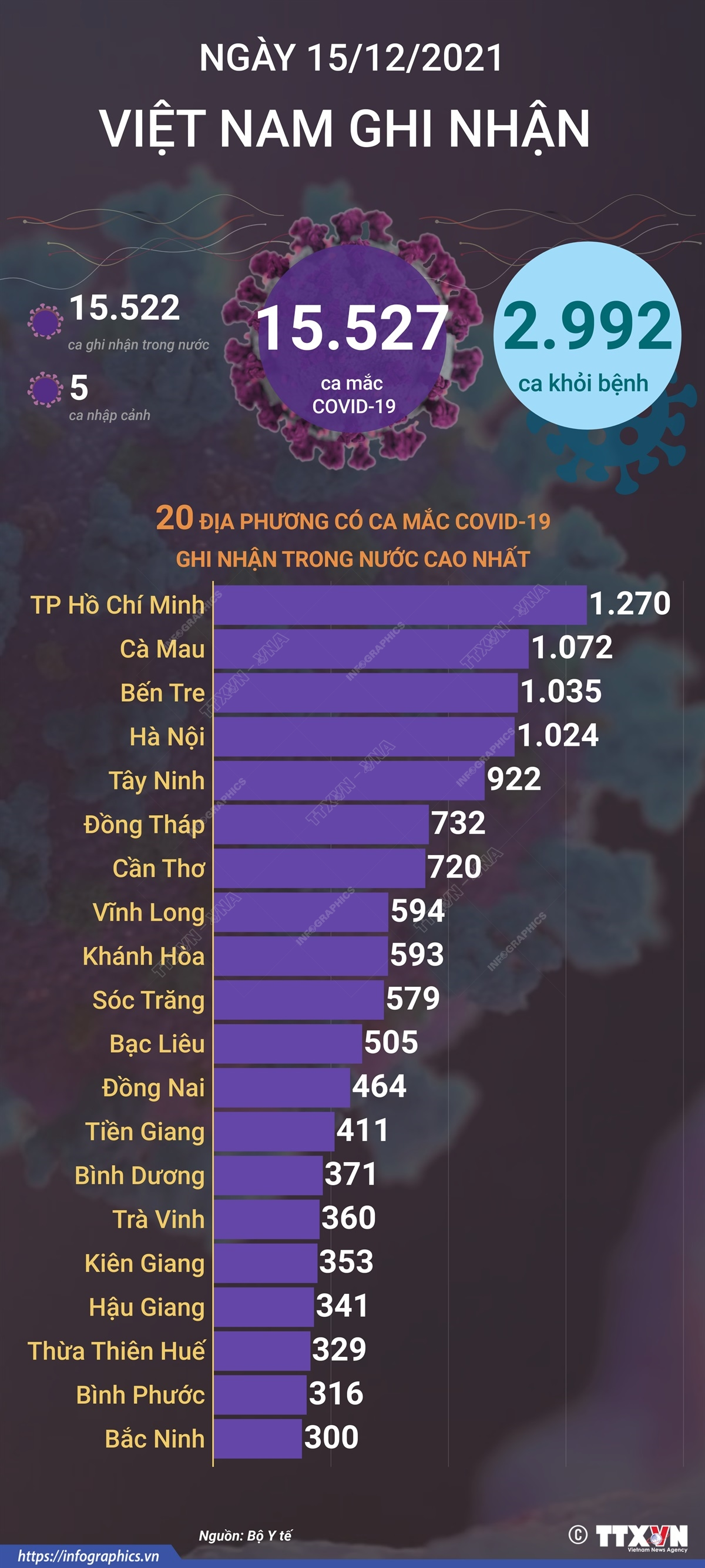 Tính từ 16h ngày 14/12 đến 16h ngày 15/12/2021, Việt Nam ghi nhận 15.527 ca mắc mới COVID-19, trong đó 5 ca nhập cảnh và 15.522 ca trong nước tại 61 tỉnh, thành phố.