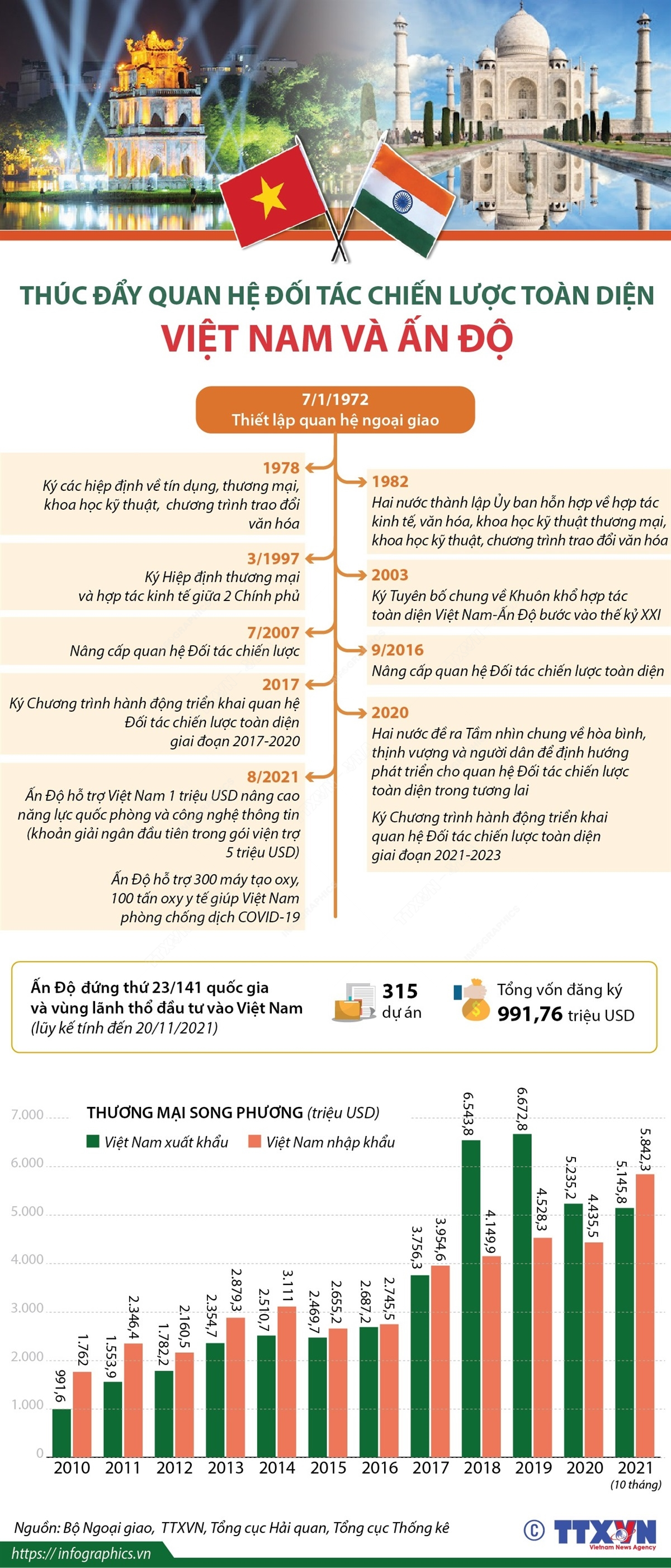 Kể từ khi thiết lập quan hệ ngoại giao ngày 7/1/1972, Ấn Độ và Việt Nam luôn ủng hộ, giúp đỡ lẫn nhau trong mục đích chung mưu cầu hạnh phúc cho nhân dân hai nước. Quan hệ ngoại giao giữa Việt Nam và Ấn Độ hiện đang ở mức Đối tác chiến lược toàn diện, với sự phát triển mạnh mẽ, rõ ràng về chính trị, kinh tế, văn hóa, năng lượng, trao đổi giữa con người với con người.