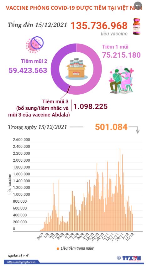 Trong ngày 15/12/2021 có 501.084 liều vaccine phòng COVID-19 được tiêm. Như vậy, tổng số liều vaccine đã được tiêm tại Việt Nam là 135.736.968 liều, trong đó tiêm 1 mũi là 75.215.180 liều, tiêm mũi 2 là 59.423.563 và tiêm mũi 3 (tiêm bổ sung/tiêm nhắc và mũi 3 của vaccine Abdala) là 1.098.225 liều.