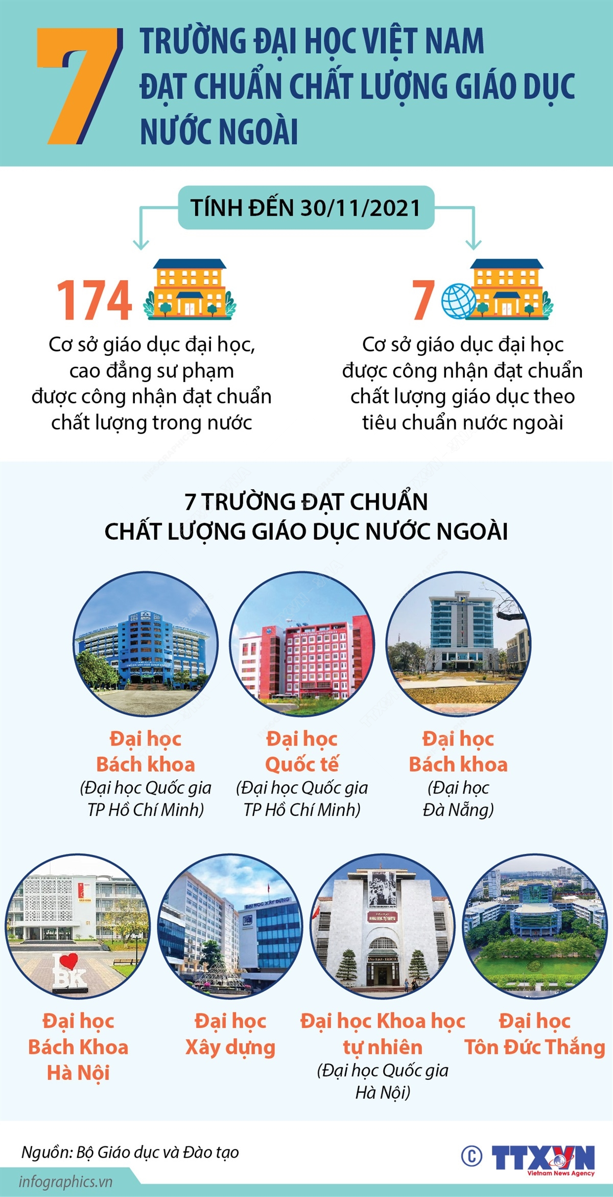 Theo Cục Quản lý chất lượng (Bộ Giáo dục và Đào tạo), hiện cả nước có 7 trường đại học đạt chuẩn chất lượng giáo dục theo tiêu chuẩn nước ngoài và 174 cơ sở giáo dục đại học, cao đẳng sư phạm được công nhận đạt chuẩn chất lượng trong nước.