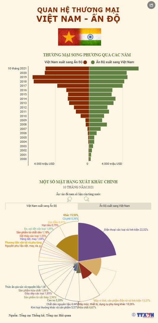 Ấn Độ hiện là một trong 10 đối tác thương mại lớn nhất của Việt Nam, với kim ngạch thương mại hai chiều tăng dần qua các năm, tăng trưởng bình quân 17,5%/năm trong giai đoạn 2010 - 2020.
