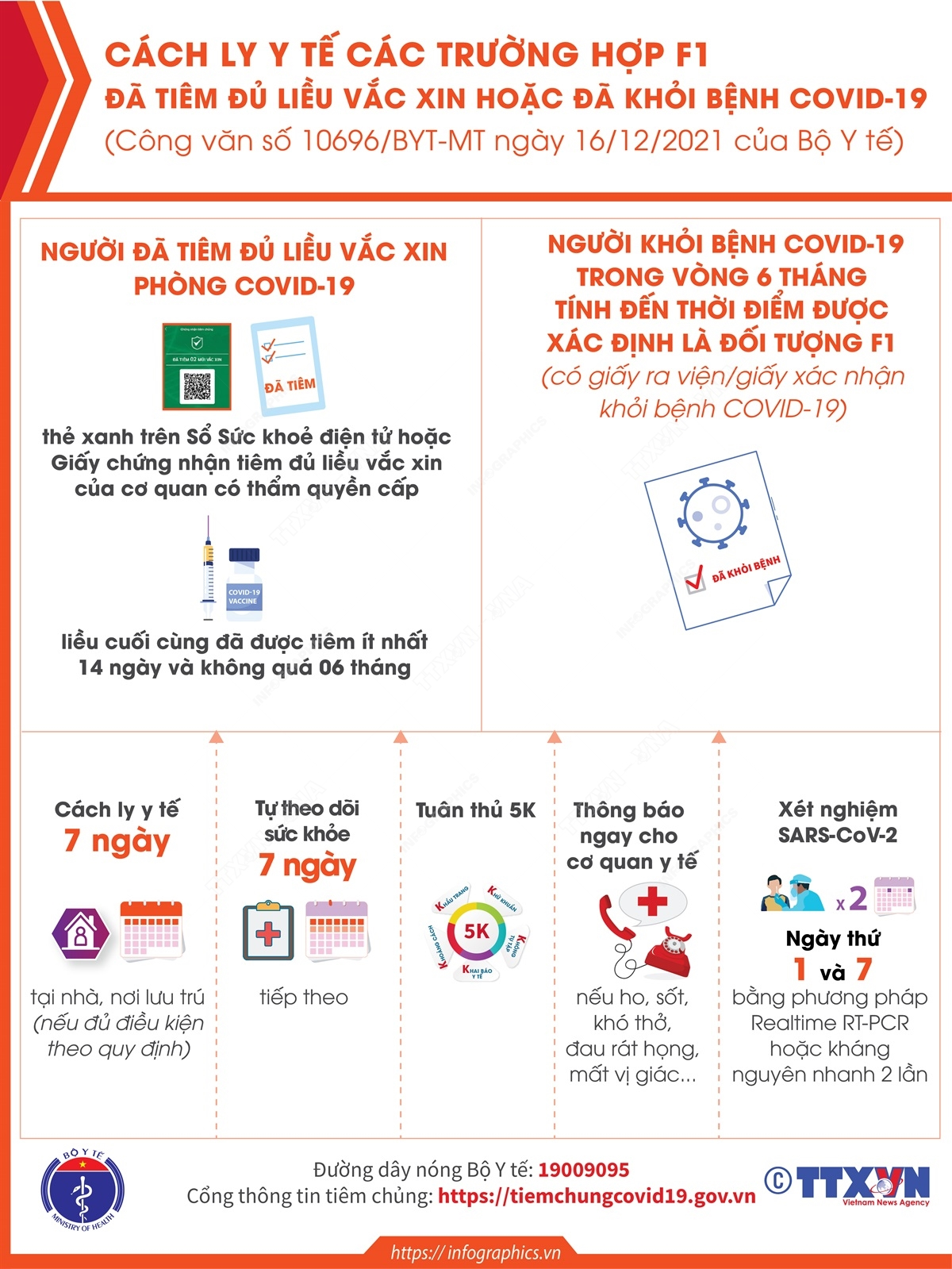 Bộ Y tế vừa có Công văn số 10696/BYT-MT đến Ủy ban nhân dân các tỉnh, thành phố trực thuộc Trung ương về việc cách ly y tế cho trường hợp F1 đã tiêm đủ liều vắc xin hoặc đã khỏi bệnh COVID-19.