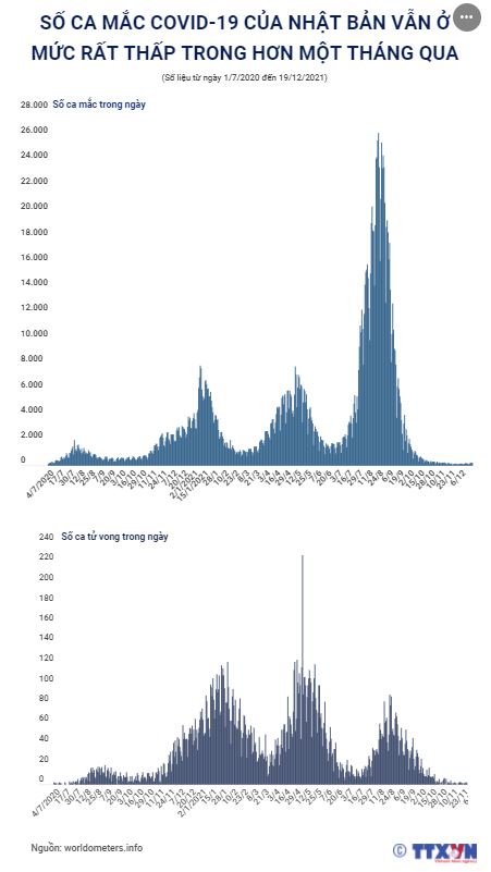 Trong hơn 1 tháng qua, số ca mắc COVID-19 trong ngày ở Nhật Bản vẫn ở mức thấp, với trên 100 ca/ngày. Từ đầu dịch đến nay, Nhật Bản ghi nhận trên 1,7 triệu ca mắc COVID-19 và 18.379 ca tử vong.
