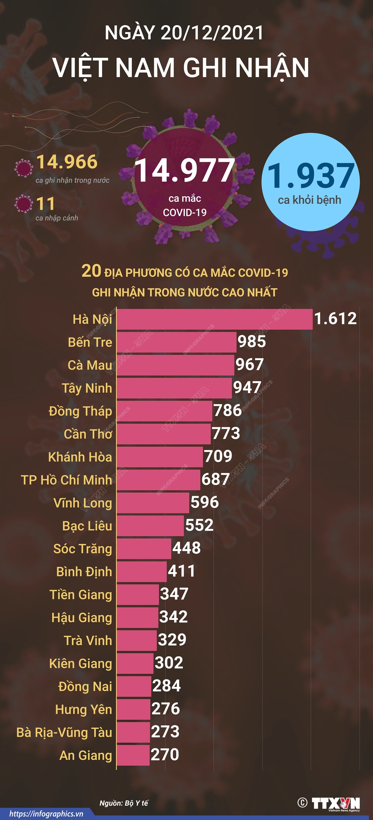 Tính từ 16h ngày 19/12 đến 16h ngày 20/12, Việt Nam ghi nhận 14.977 ca mắc mới COVID-19, trong đó 11 ca nhập cảnh và 14.966 ca trong nước tại 61 tỉnh, thành phố.