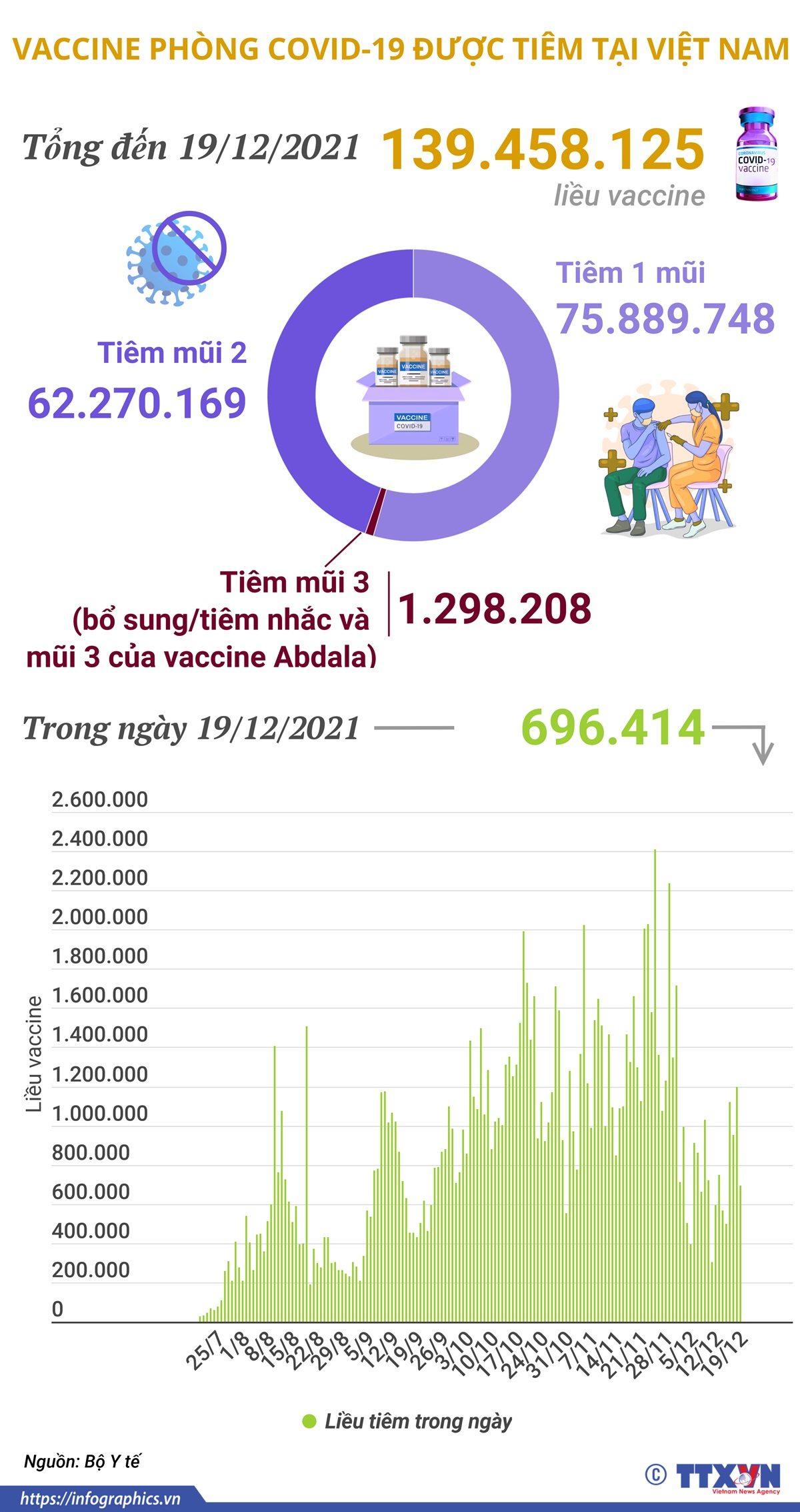 Trong ngày 19/12/2021 có 696.414 liều vaccine phòng COVID-19 được tiêm. Như vậy, tổng số liều vaccine đã được tiêm tại Việt Nam là 139.458.125 liều, trong đó tiêm 1 mũi là 75.889.748 liều, tiêm mũi 2 là 62.270.169 và tiêm mũi 3 (tiêm bổ sung/tiêm nhắc và mũi 3 của vaccine Abdala) là 1.298.208 liều.