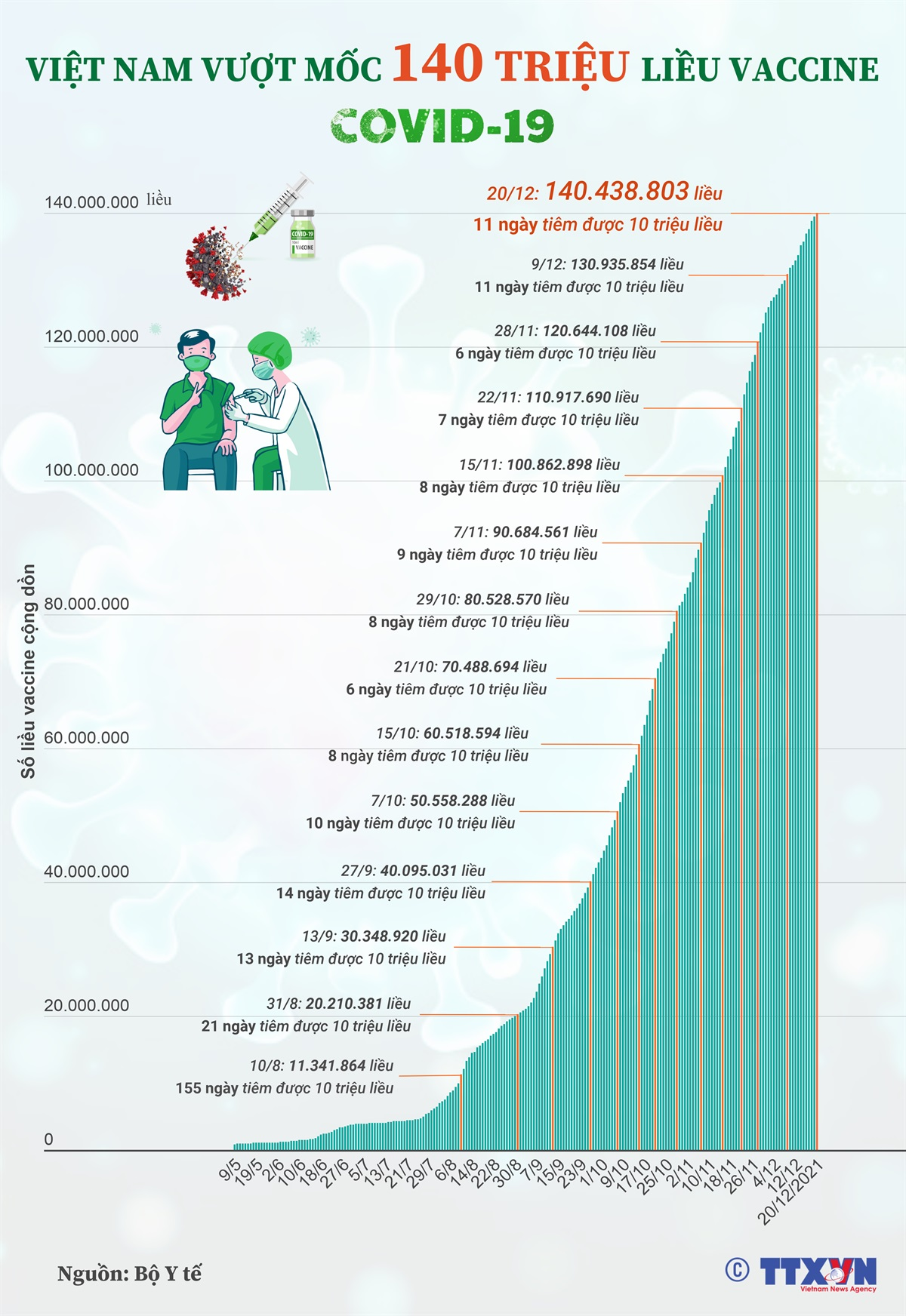 Tính tới ngày 20/12/2021, Việt Nam đã vượt hơn 140,4 triệu liều tiêm vaccine phòng COVID-19. Tổng số tiêm 1 mũi là 76.115.342 liều, tiêm mũi 2 là 62.959.544 và tiêm mũi 3 (tiêm bổ sung/tiêm nhắc và mũi 3 của vaccine Abdala) là 1.363.917 liều.. Riêng trong ngày 20/12/2021 có 981.748 liều vaccine phòng COVID-19 được tiêm.