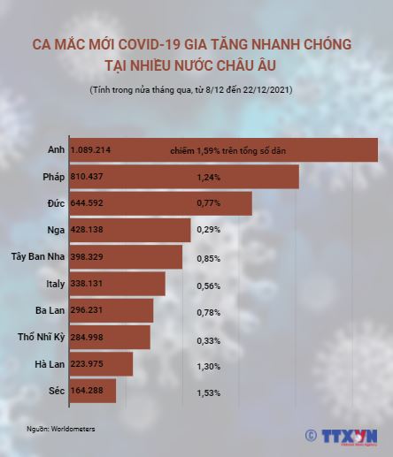 Biến thể Omicron đang khiến đồ thị dịch COVID-19 tăng cao với số ca mắc mới tăng mạnh trở lại. Tại Châu Âu, Anh ghi nhận trên 100.000 ca mắc COVID-19 trong ngày 22/12, số ca mắc cao nhất kể từ đầu năm 2021. Các nước như: Pháp, Tây Ban Nha, Italy,... cũng ghi nhận số ca mắc mới tăng vọt. Trước tình hình dịch bệnh đang tái bùng phát ở châu Âu, nhiều nước đã có những biện pháp mạnh nhằm hạn chế việc đi lại và thúc đẩy người dân đi tiêm vaccine ngừa COVID-19.
