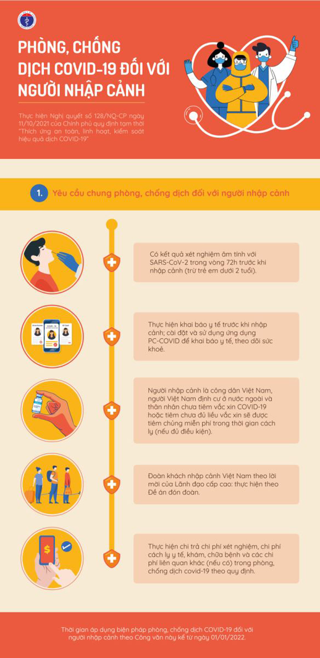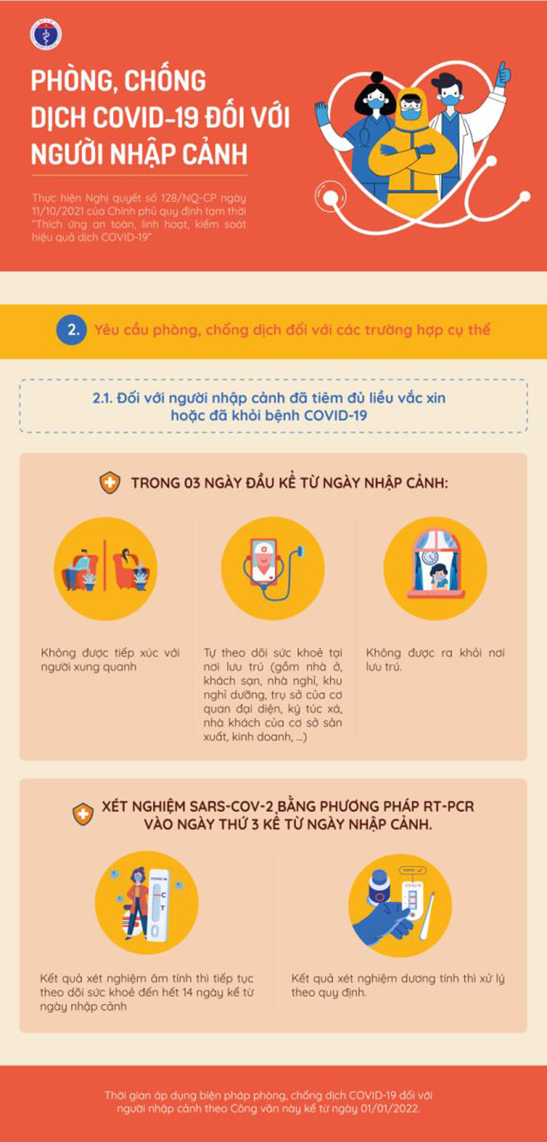 Theo quy định mới nhất của Bộ Y tế áp dụng từ ngày 1-1-2022 tới, đối với người nhập cảnh, ngoài các yêu cầu chung về phòng, chống dịch bệnh còn có các yêu cầu riêng dành cho các đối tượng cụ thể như: Người nhập cảnh đã tiêm đủ liều vắc xin hoặc đã khỏi bệnh Covid-19; người nhập cảnh chưa tiêm vắc xin hoặc tiêm chưa đủ liều vắc xin Covid-19.